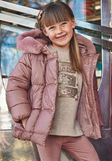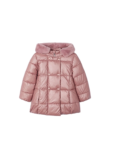 Winterjas voor meisjes van het merk Mayoral. Deze wat langere jas heeft een capuchon met bontkraag en verkrijgbaar in het roze.