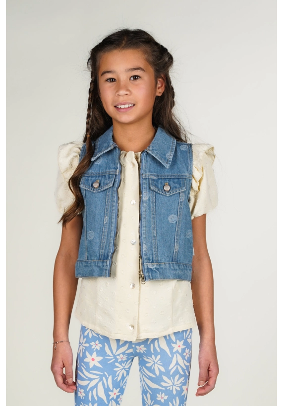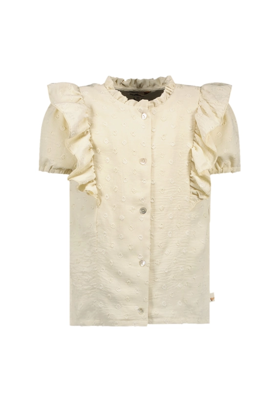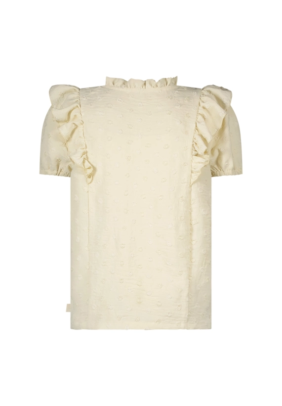 Korte mouw en met rijtje ruchels aan de voorkant van het shirt.