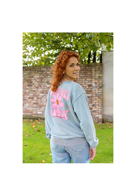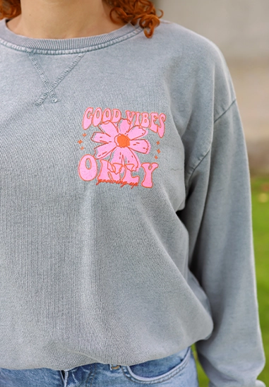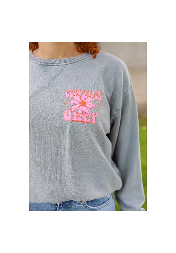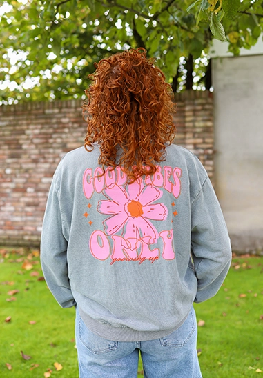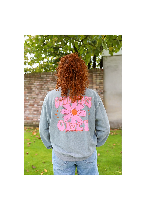 Met bloemprint met tekst 'good vibes only' op voor en achterkant