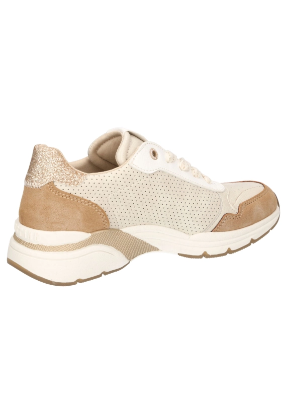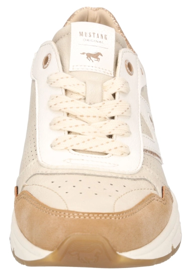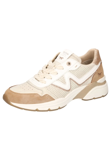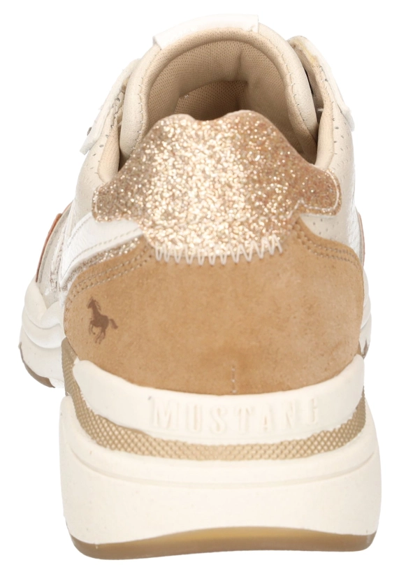 Sneakers voor dames van het merk Mustang. Verkrijgbaar in de kleur beige & beige met print.