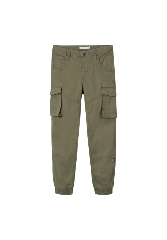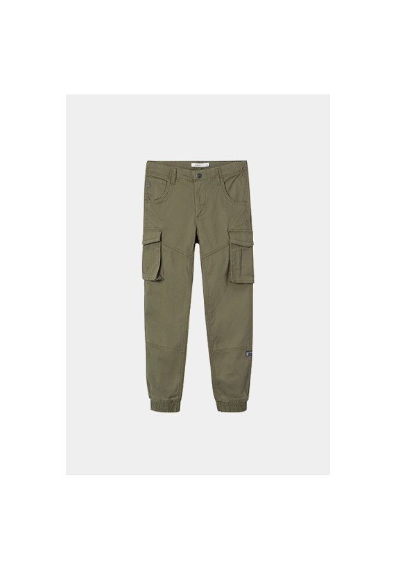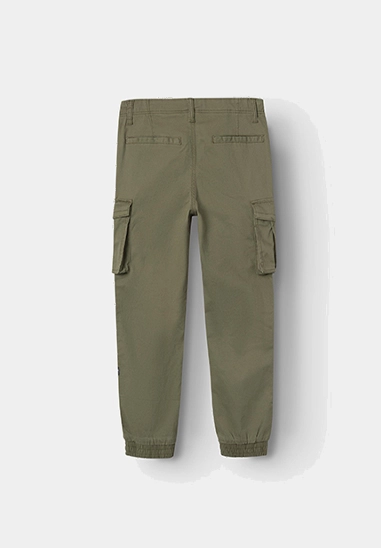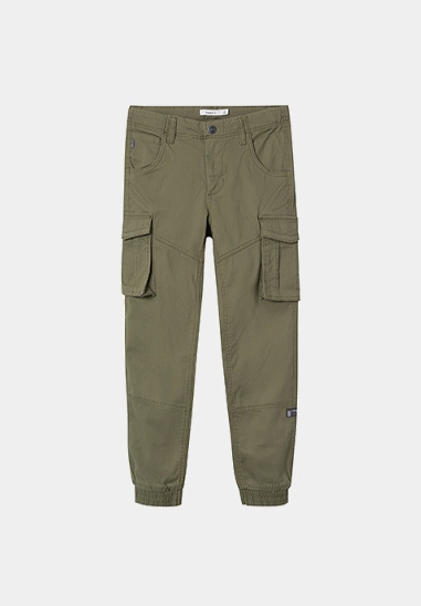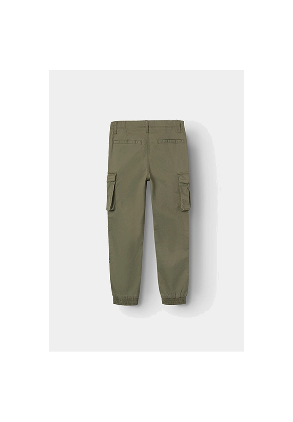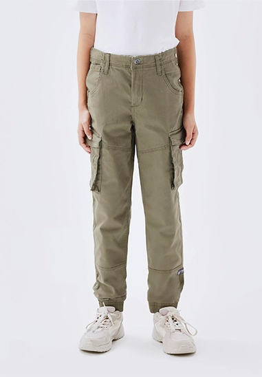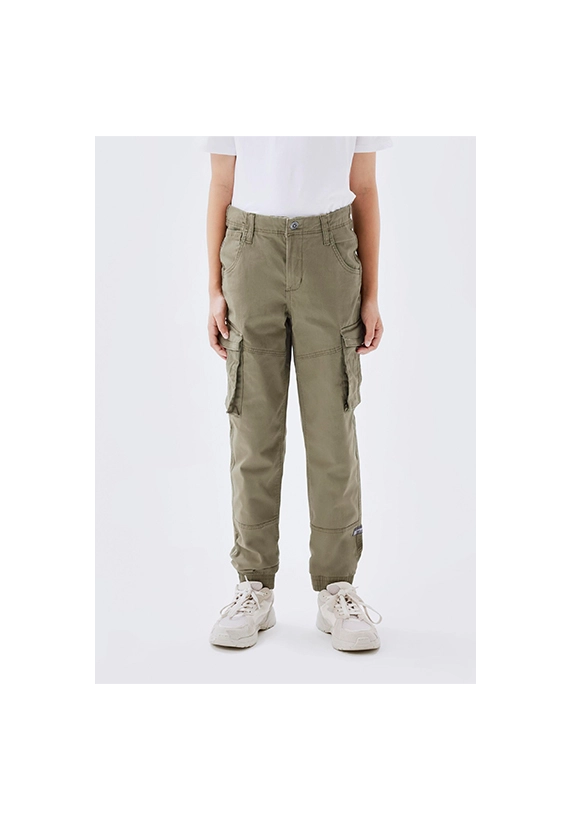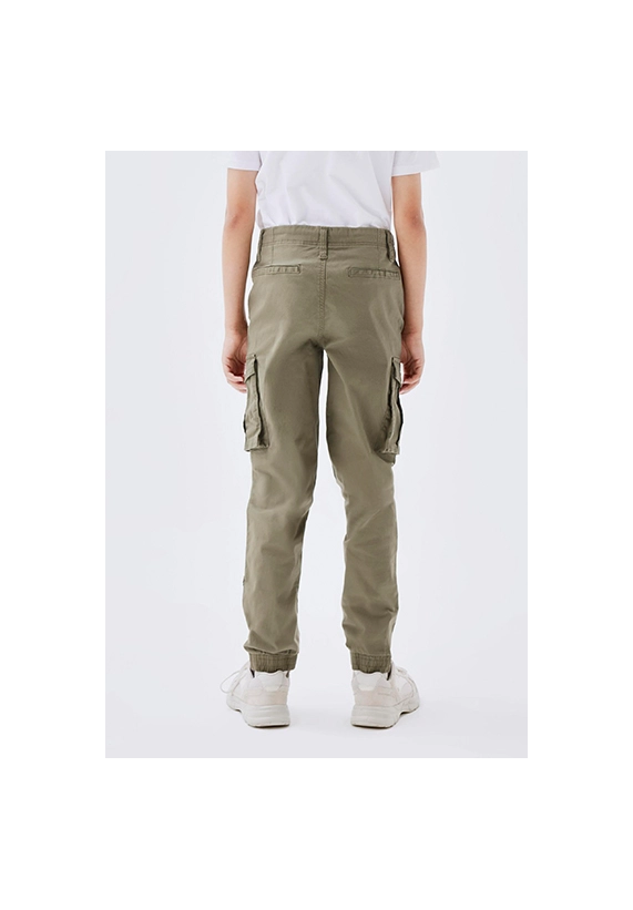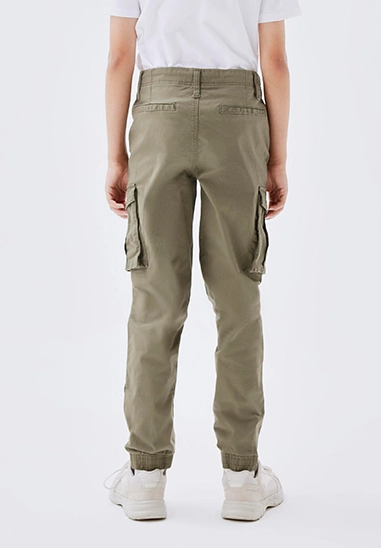 Cargo broek Ryan voor jongens van het merk Name it. Verkrijgbaar in de kleur groen, beige en grijs. Zakken aan de zijkant en aan de onderkant afgewerkt met elastiek. Voorzien van een verstelbare elastische band.