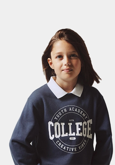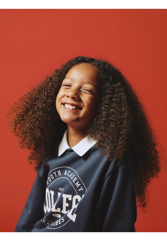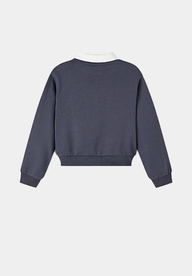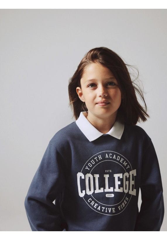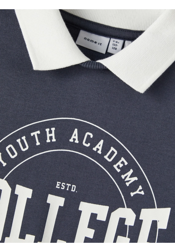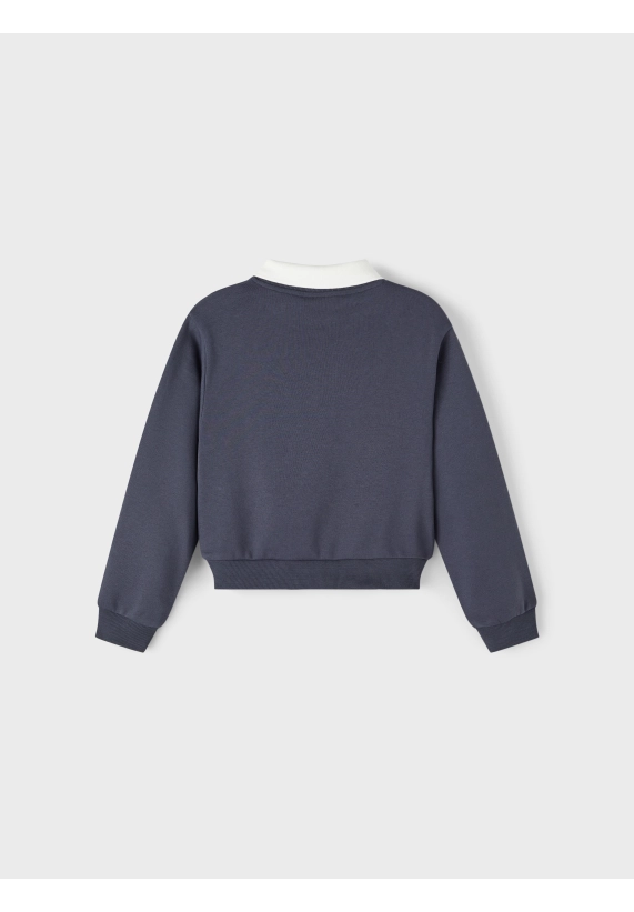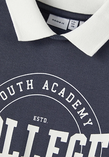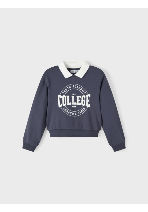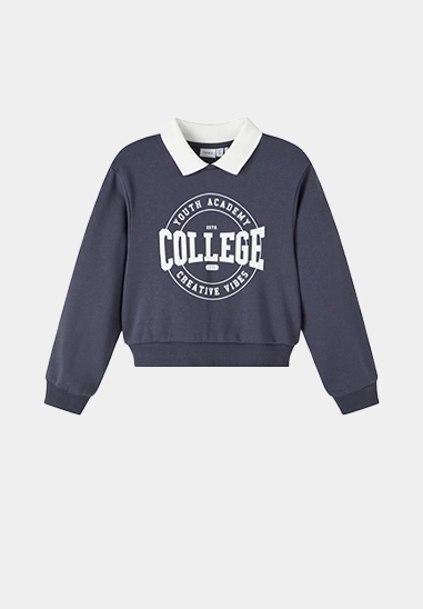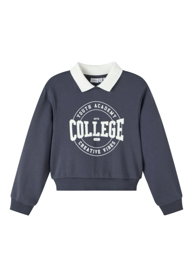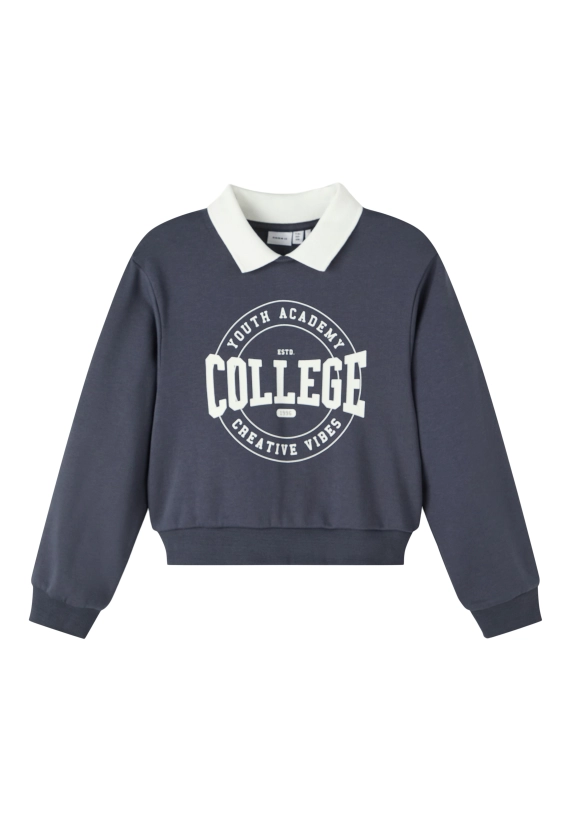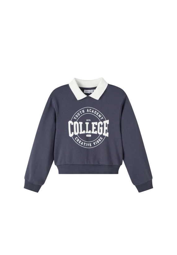 College sweater Nasmi voor meisjes van het merk Name It. De sweater heeft een kraagje. Verkrijgbaar in donker blauw en fel rood.