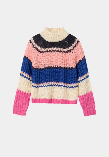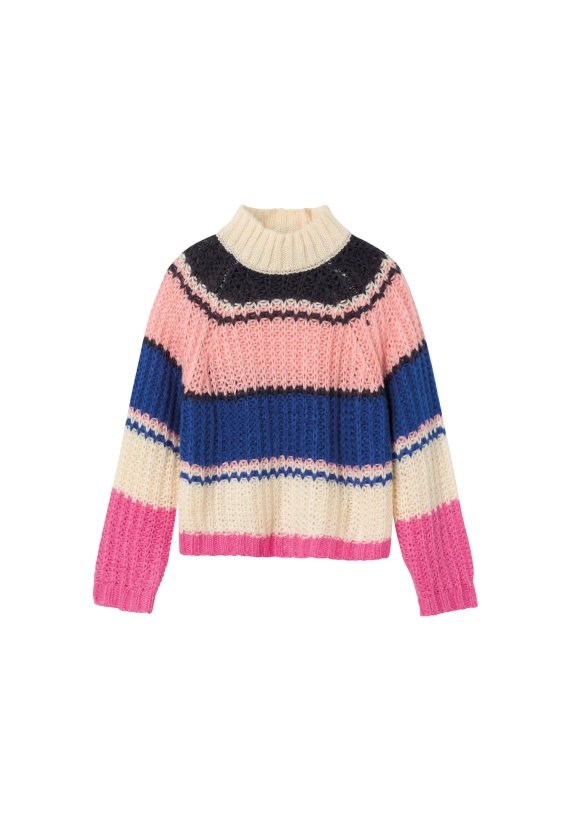 Grof gebreide trui Namette voor meisjes van het merk Name It. De trui heeft een opstaande boord en meerdere kleuren horizontale strepen. Verkrijgbaar in twee kleurencombinaties.