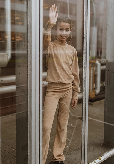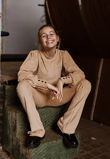Flared broek voor meisjes van het merk No Way Moday. De broek is gemaakt van een zachte rib kwaliteit. De broek is verkrijgbaar in het camel.