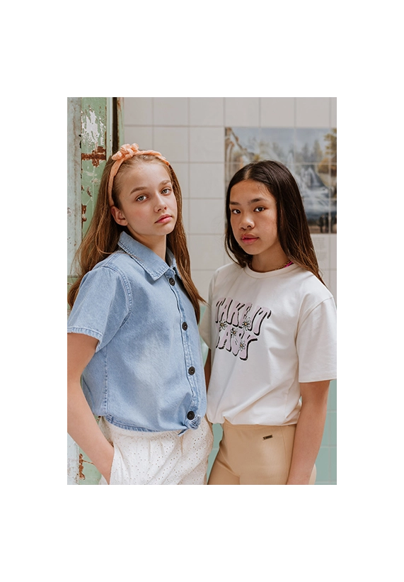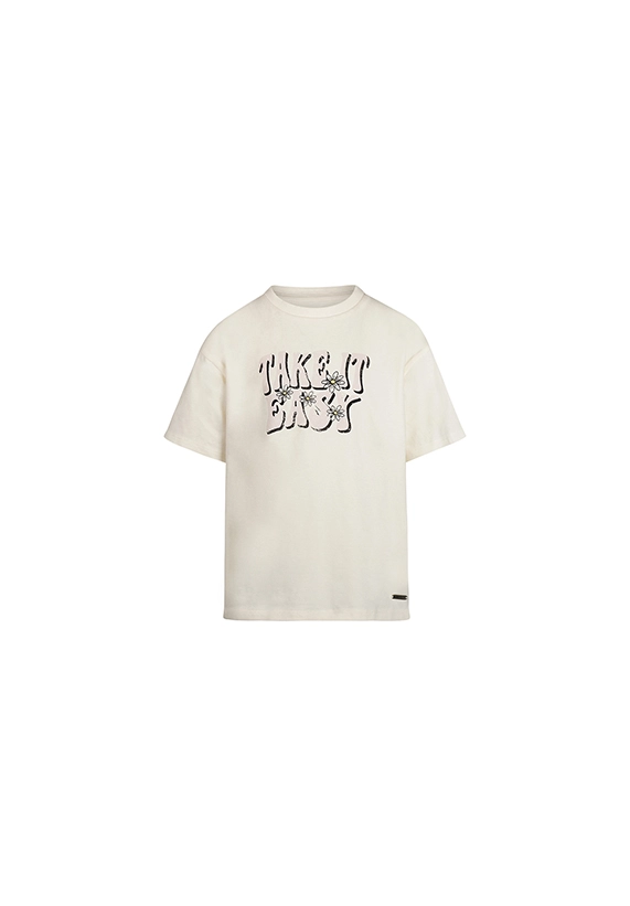 T-shirt korte mouwen voor meisjes van het merk No Way Monday. Het shirt is een loose fit model en verkrijgbaar met een print in de kleur ivoor wit.