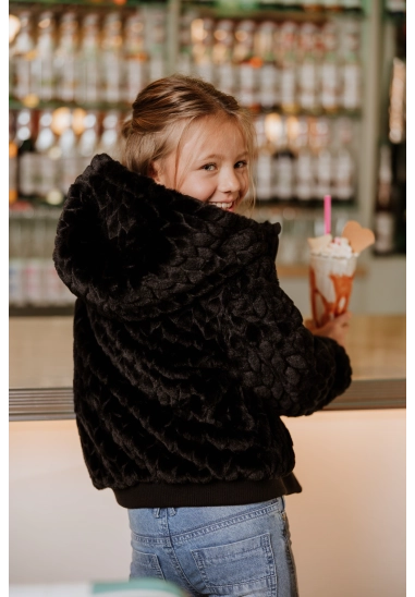 Bontjas in zwarte kleur heeft een subtiel motief in het imitatiebont, wat het helemaal trendy maakt.