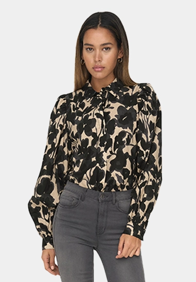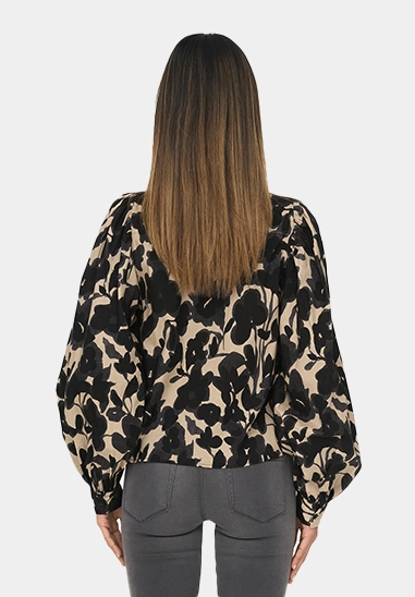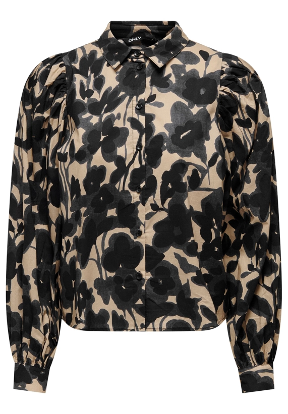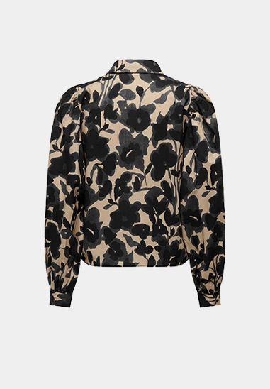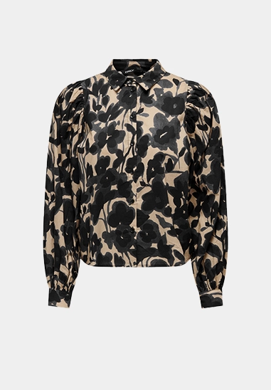 Deze blouse met lange mouwen heeft een kraag, allover print en pofmouwen. Verkrijgbaar in de kleur beige.
