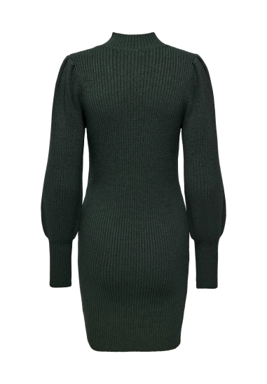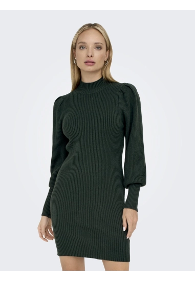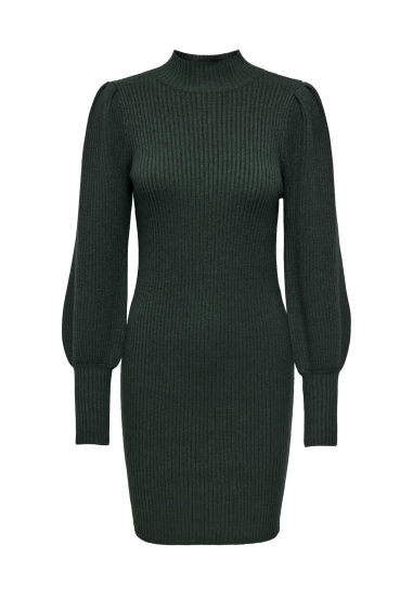 Lange gebreide jurk Katia voor dames van het merk ONLY. De jurk heeft een hoge hals en pofmouwen.