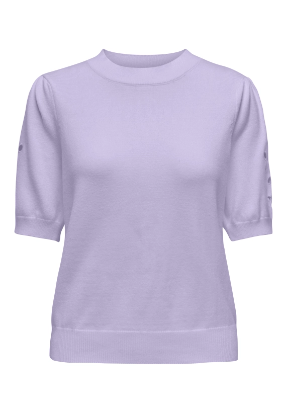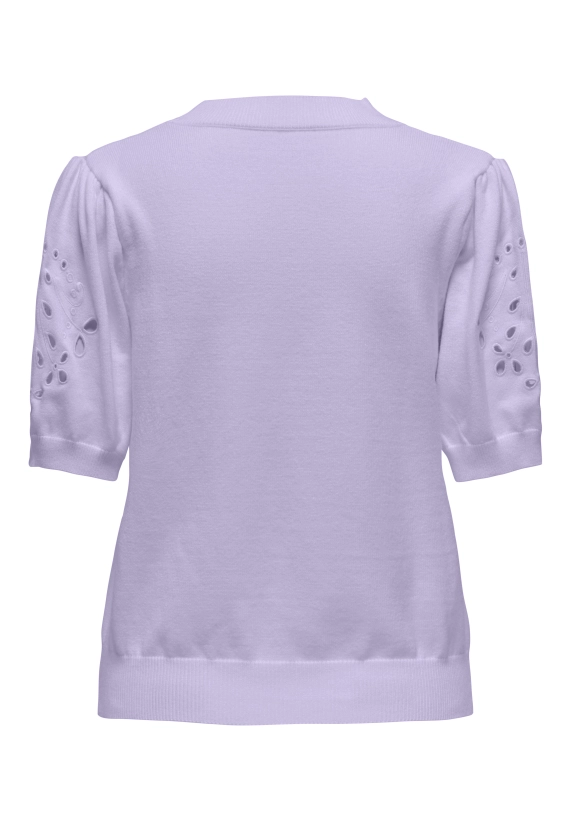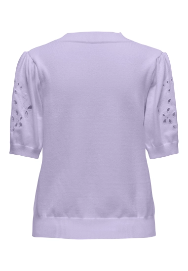 Verkrijgbaar in de kleuren blauw en lila met opengewerkte mouwen.