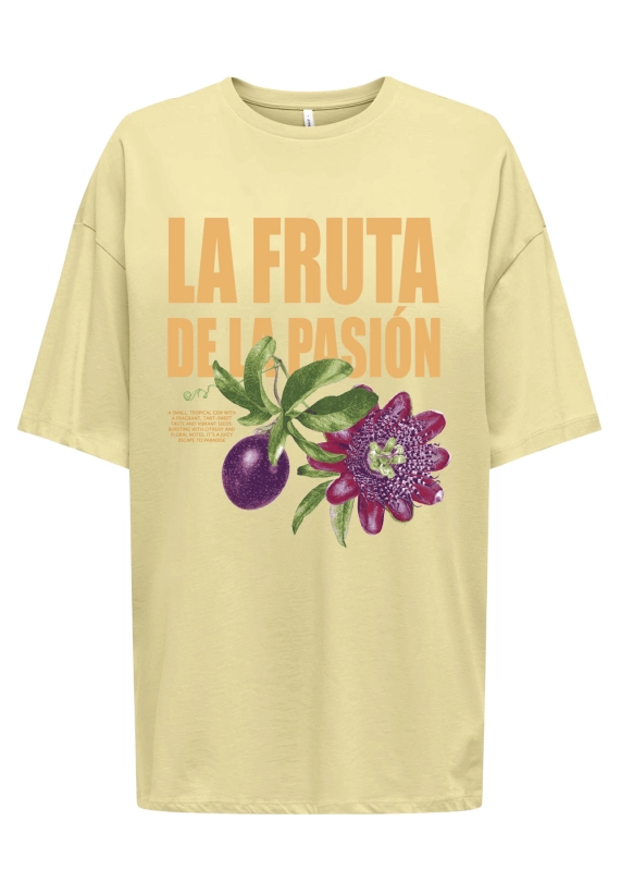 Shirt Rosie voor dames van het merk Only. Verkrijgbaar in de kleur geel & wit. Met leuke print op de voorzijde.