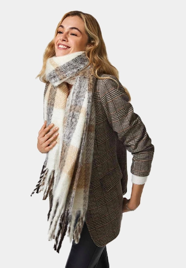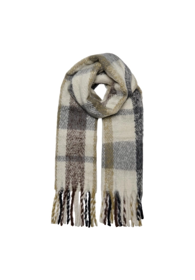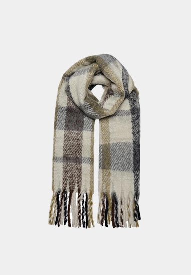 De sjaal heeft een all over geruiten patroon en franjes aan de onderkant.
