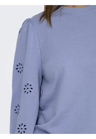 Bloemen van broderie op de mouwen.