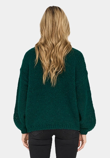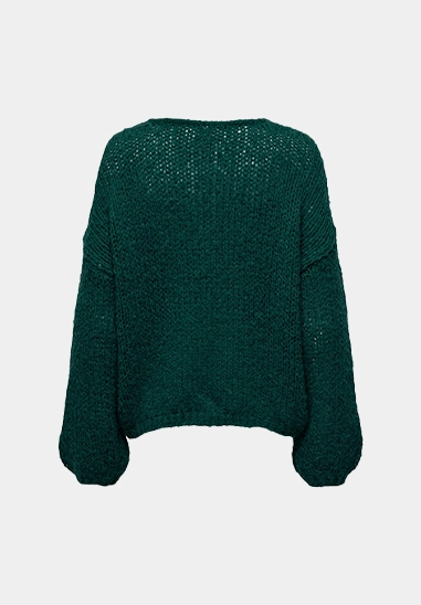 De trui heeft een ronde hals en ballon mouwen.