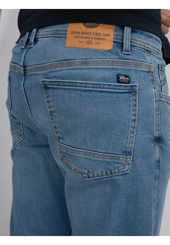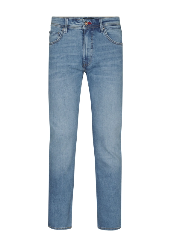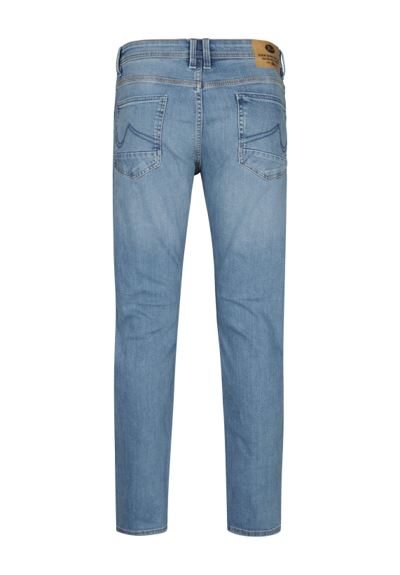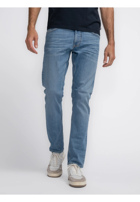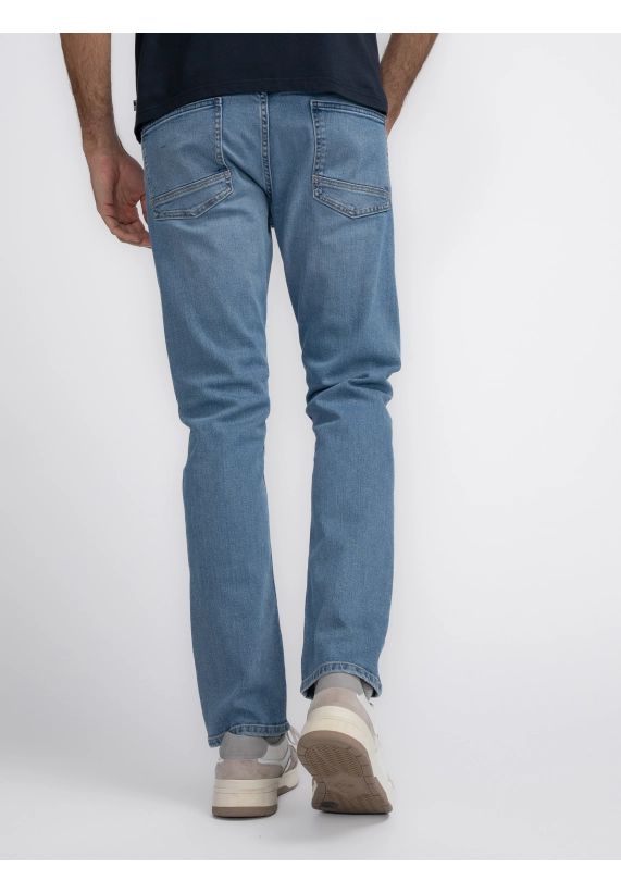 De jeans heeft een straight fit en is een 6-pocket model dankzij het verbogen tweede coinpocket.