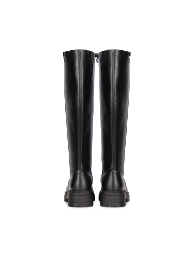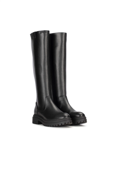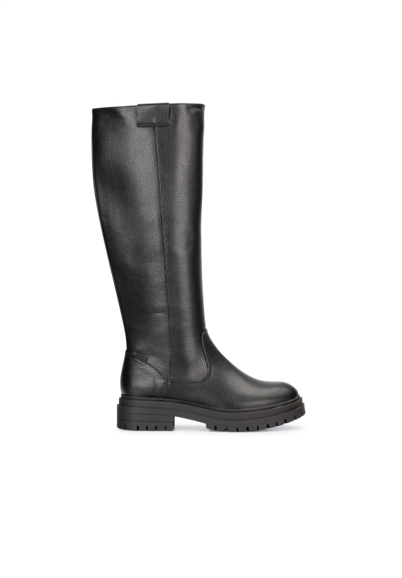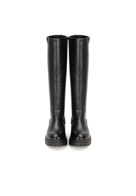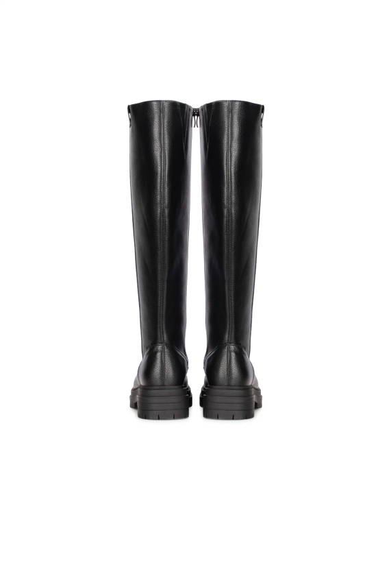 Zwarte knielaarzen met chunky zool en 4,5 cm hak.