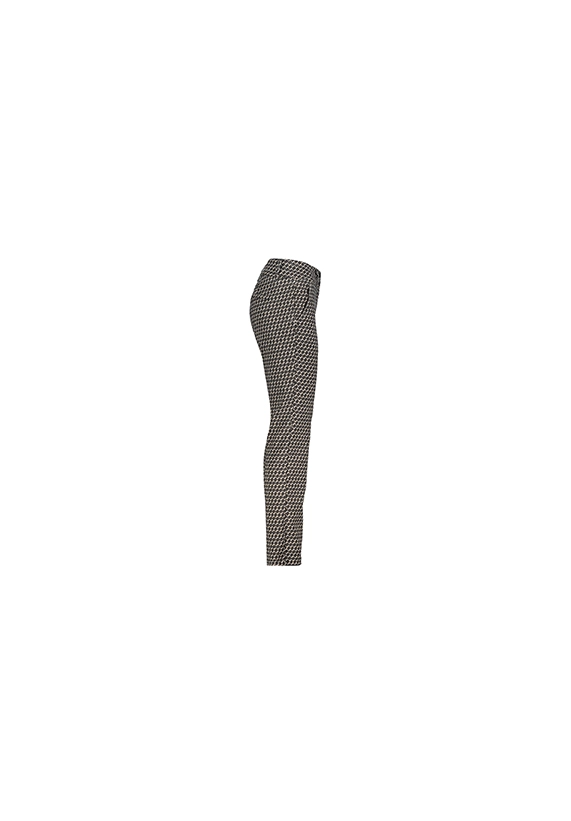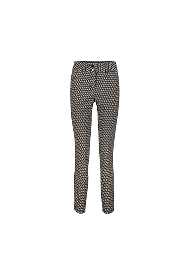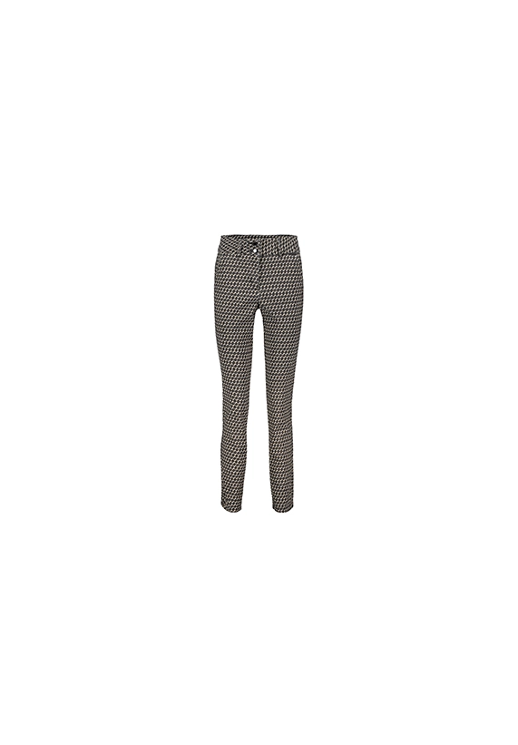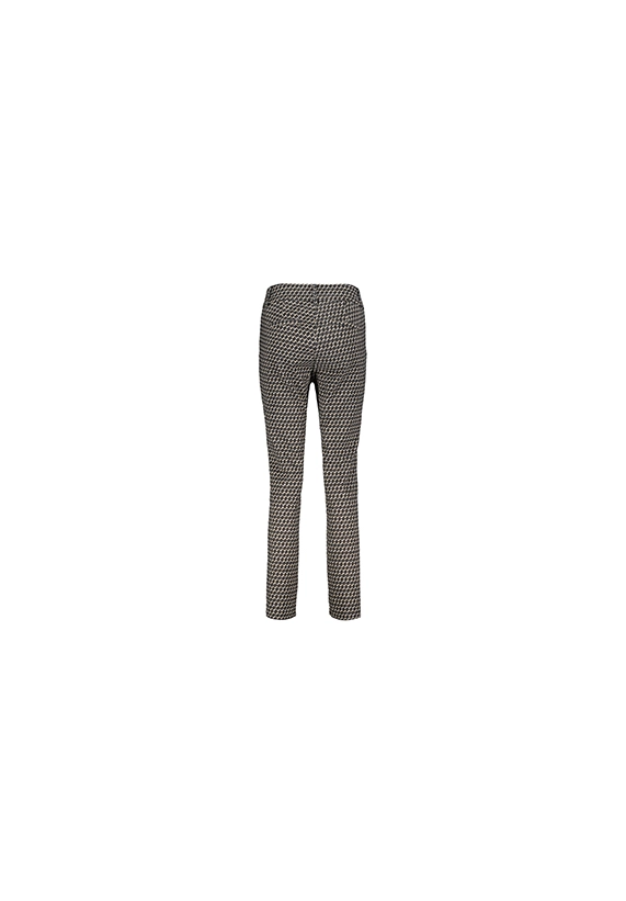 Geprinte broek Diana voor dames van het merk Red Button. De broek heeft een grafische print, hoge pasvorm in de taille, een regular fit en tapered legs. Verkrijgbaar in een zwarte kleur als ondergrond, met een beige/taupe print.