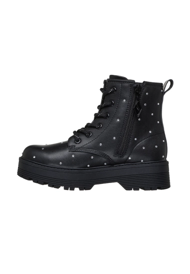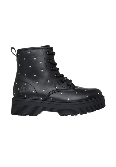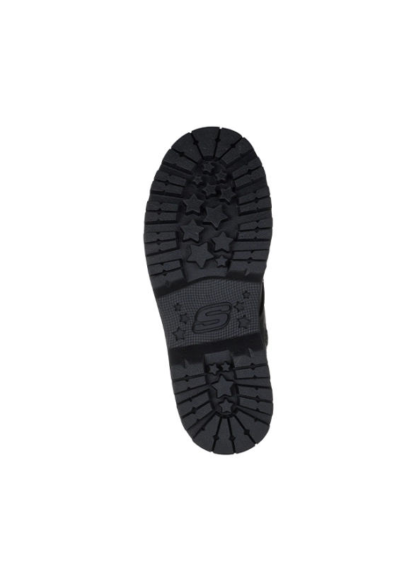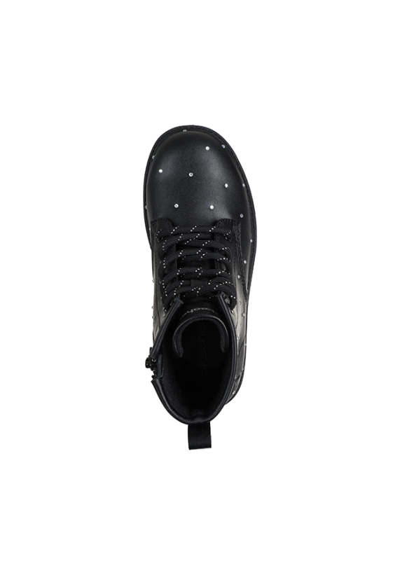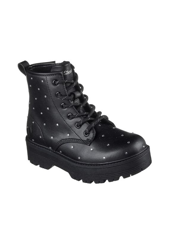 Deze Skechers-laarzen met adaptieve sluiting in combatstijl hebben een bovenwerk van imitatieleer met strass-versieringen, een ritssluiting aan de zijkant, een ronde vetersluiting en een robuuste platformmiddenzool.