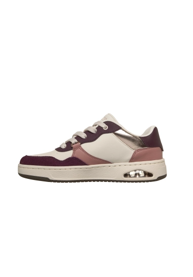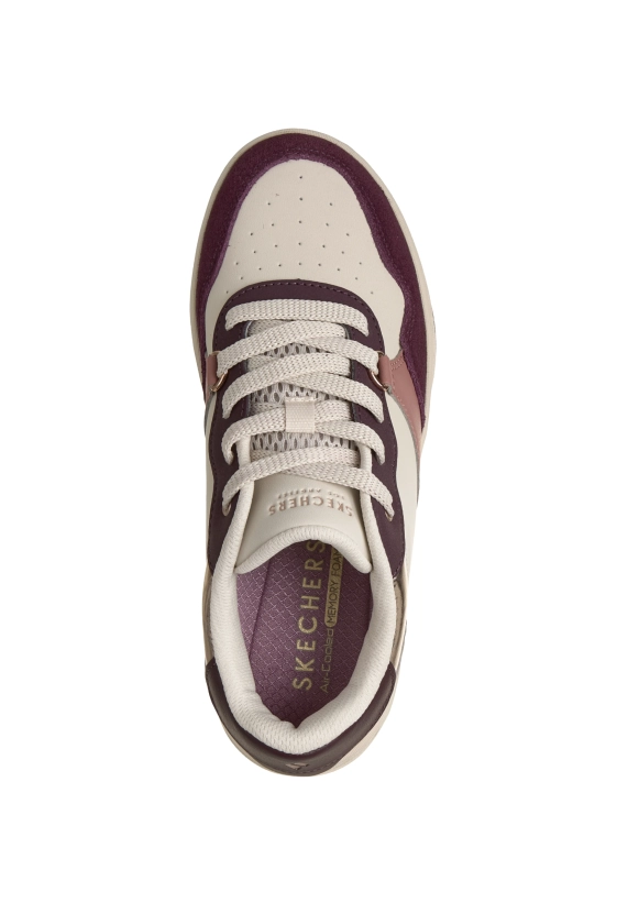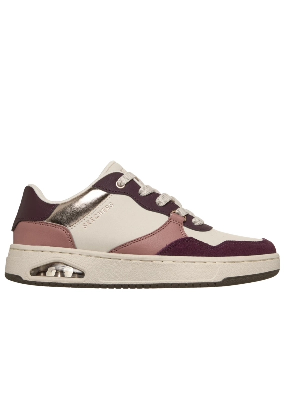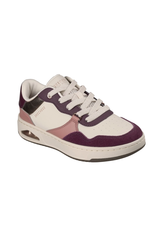 Dit trendy vetermodel in tennisstijl heeft een bovenwerk van duraleer met een sude overlay en een metallic detail op een gewatteerde Skechers Air-Cooled Memory Foam-binnenzool en een Skech-Air-tussenzool met zichtbare airunit.