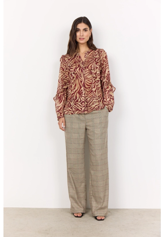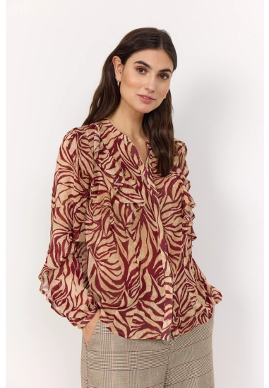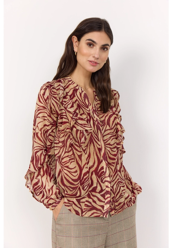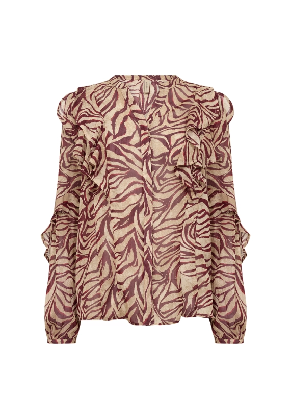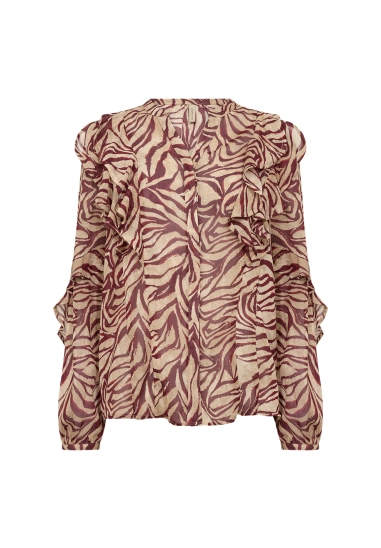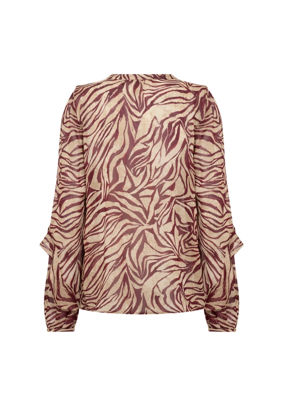 In een all-over dessin voorzien van ruches met lange mouwen. V-hals en een knoopsluiting.