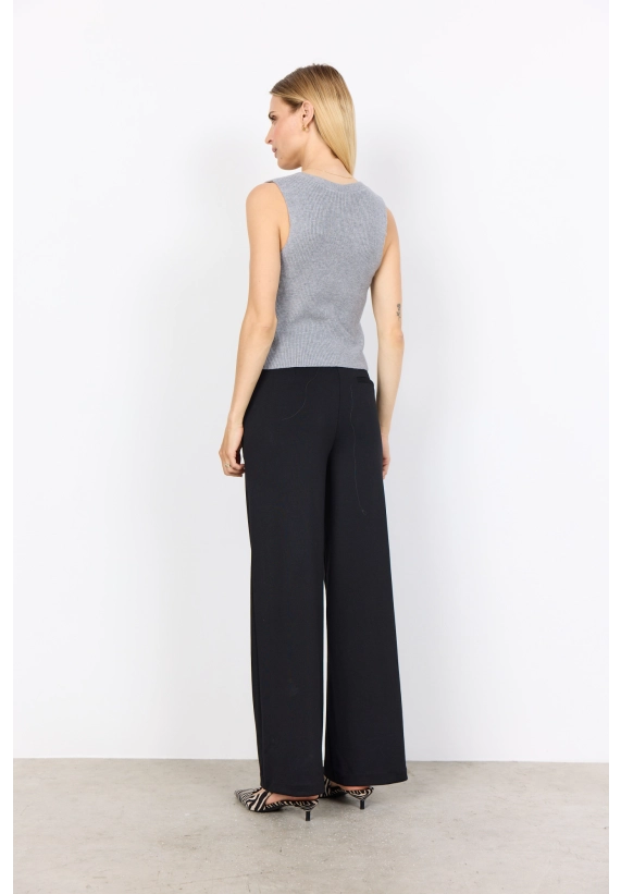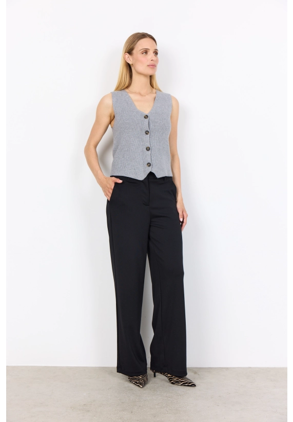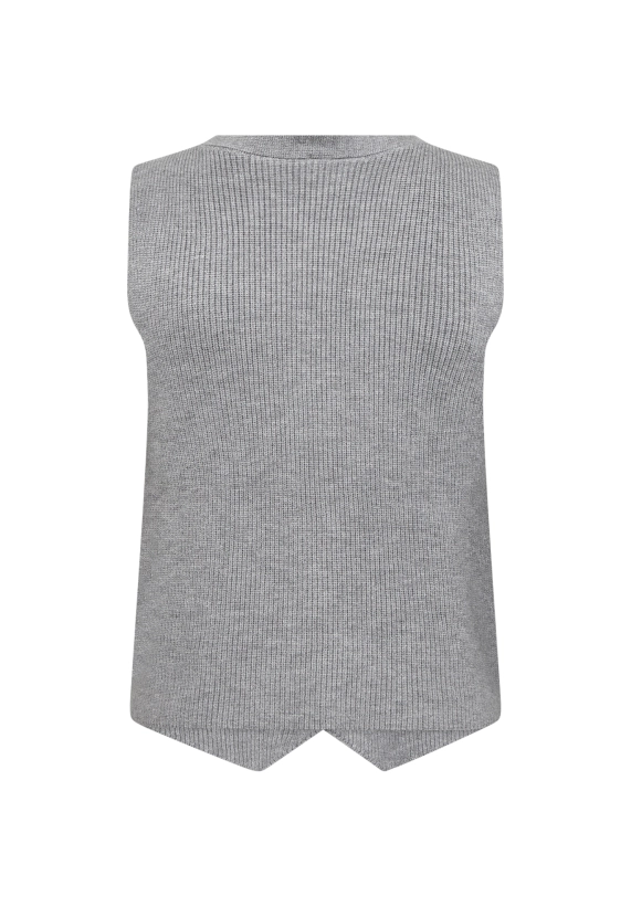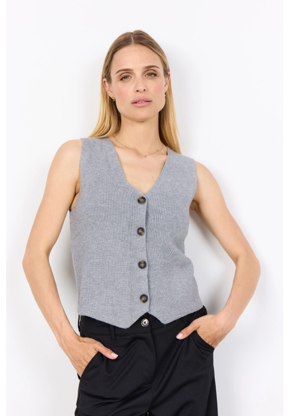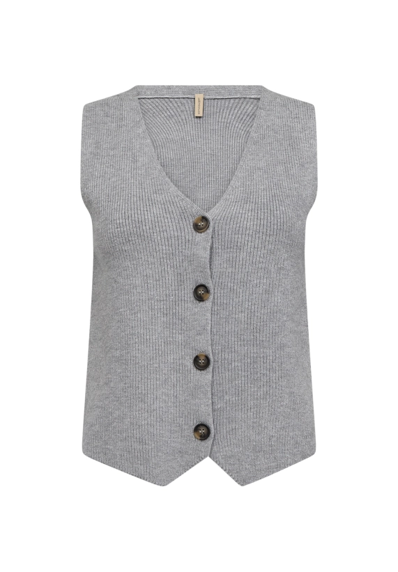 In een ribstructuur met een V-hals en een knoopsluiting.