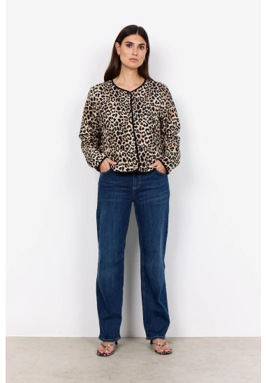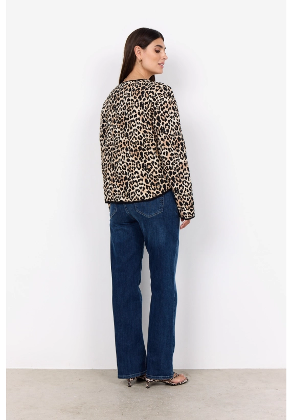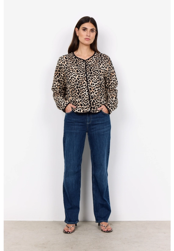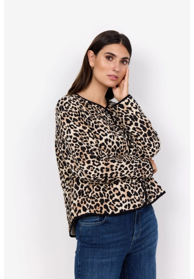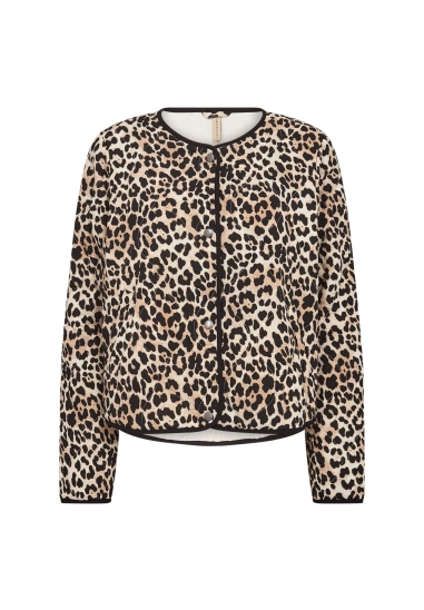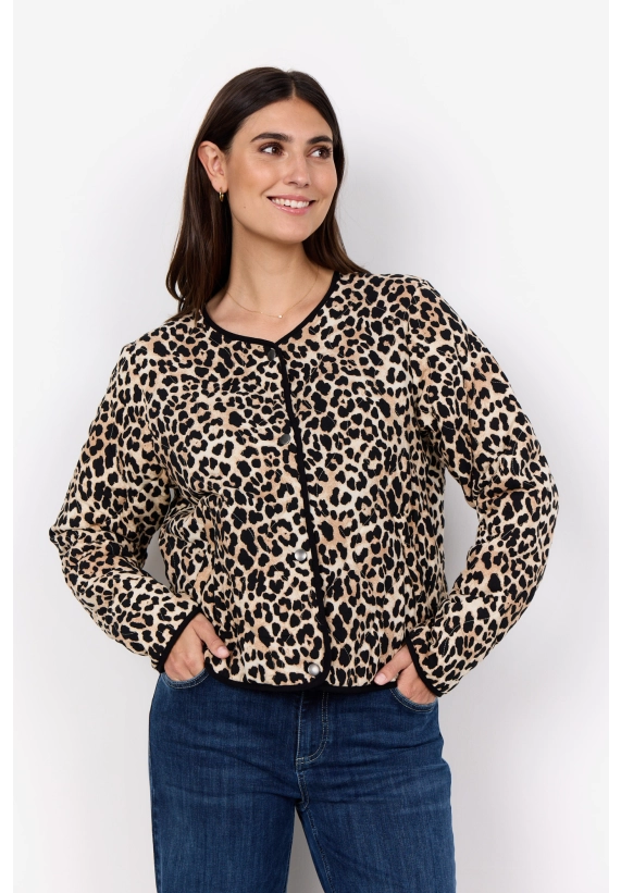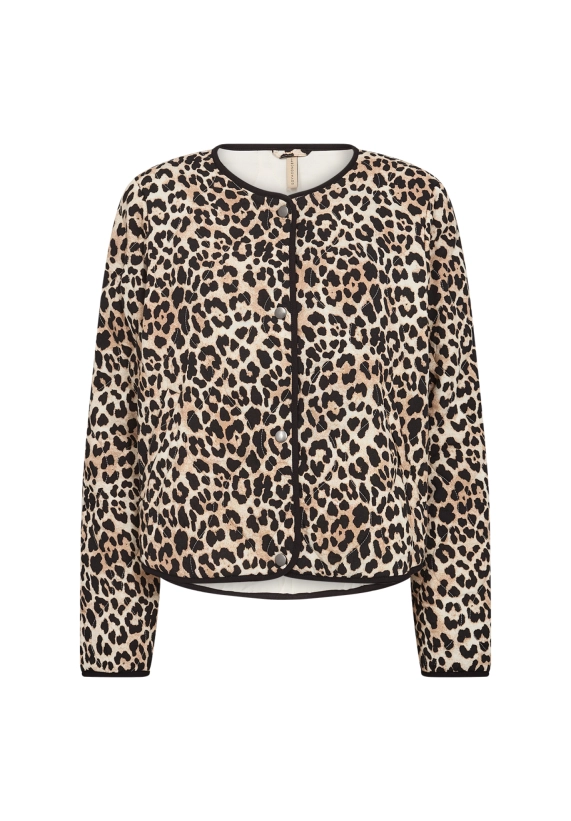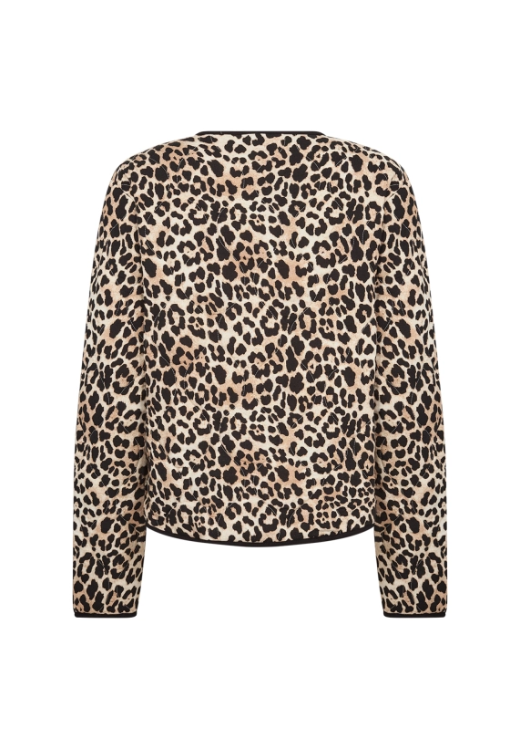 Deze jas heeft een ronde hals, knoopsluiting aan de voorkant, lange mouwen, luipaardprint en contrasterende zwarte details langs de randen.