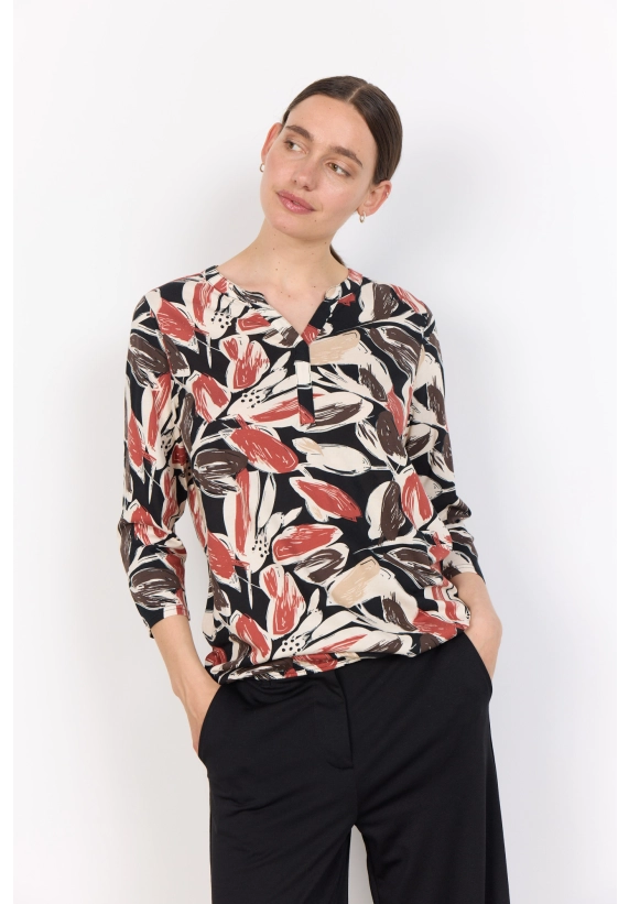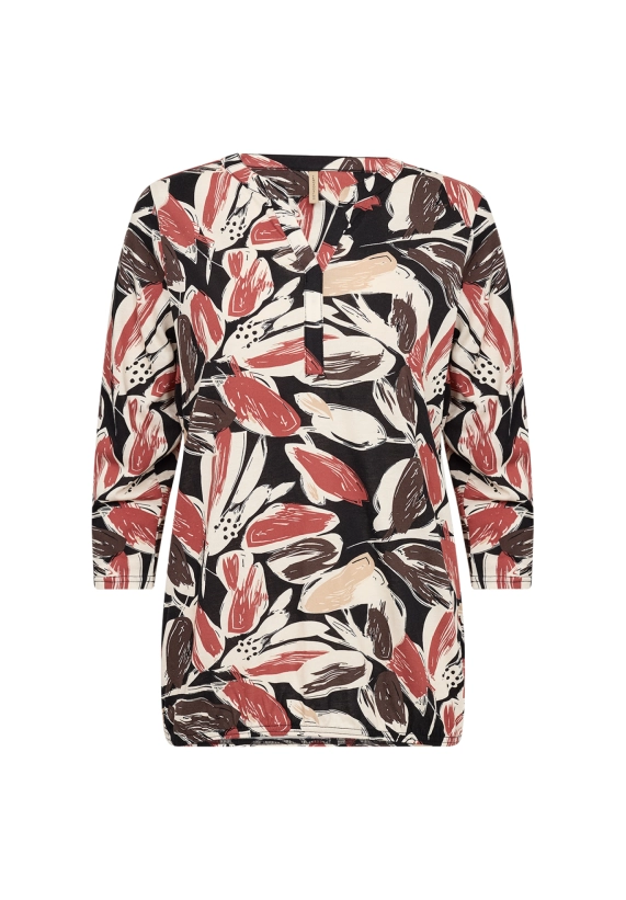 Het dames shirt Felicity van Soya Concept is vrolijk en makkelijk te dragen. Het shirt heeft een opvallende bloemenprint in zachte tinten en een V-hals die zorgt voor een leuke look. De mouwen zijn 3/4 lang, handig voor elk seizoen.