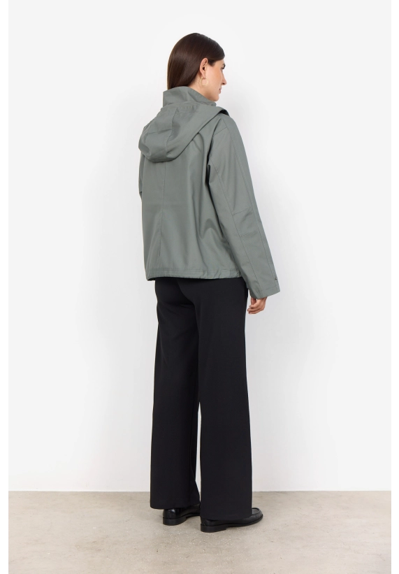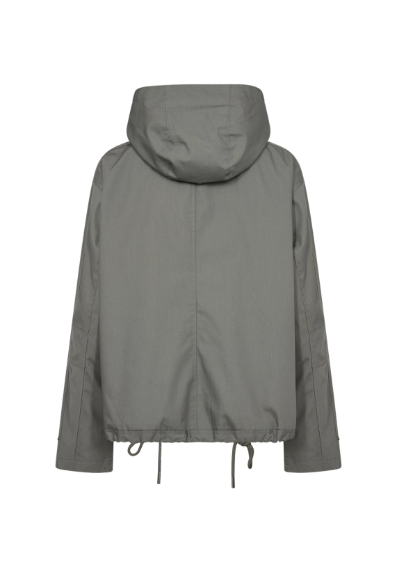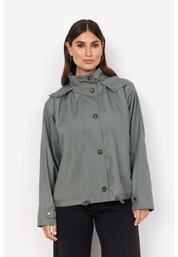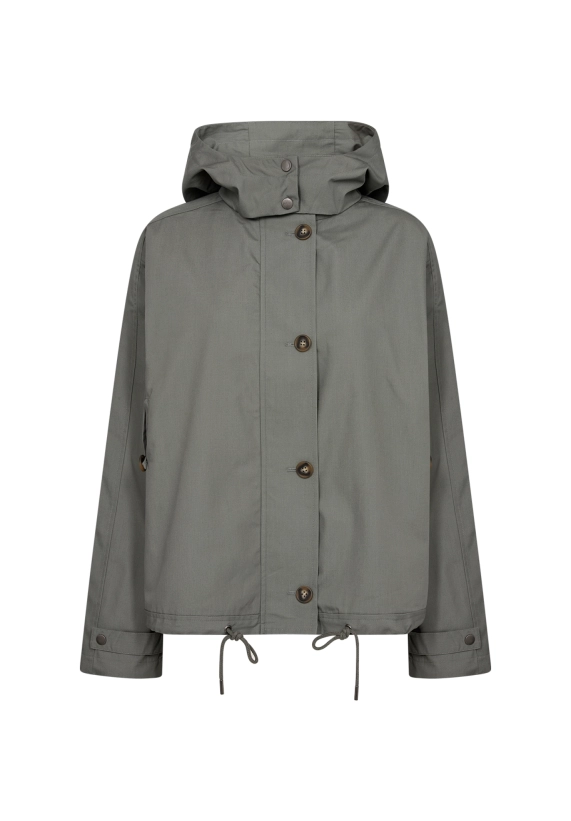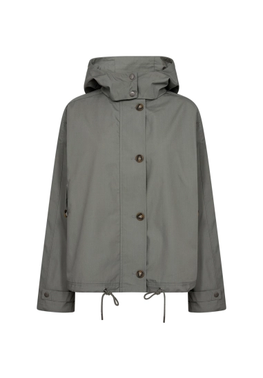 Het heeft een klassiek design met een capuchon, knoopsluiting en lange mouwen.