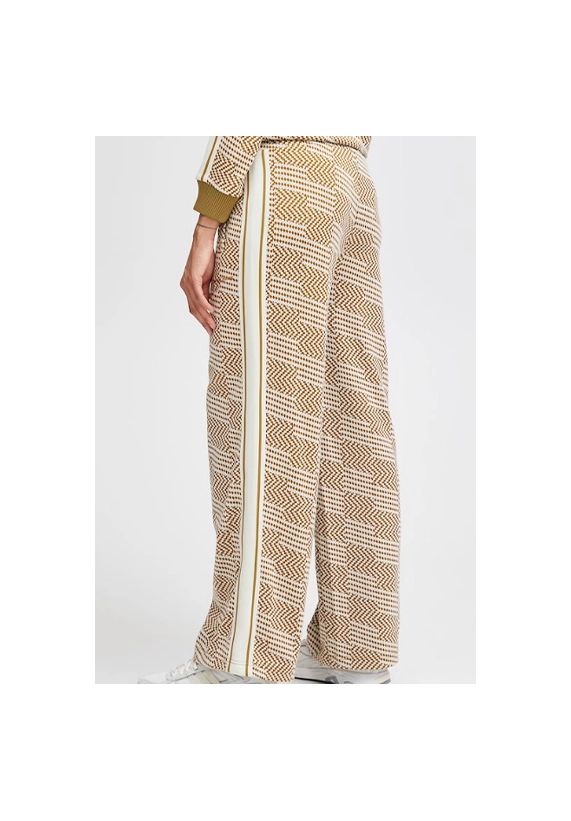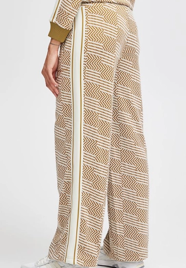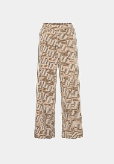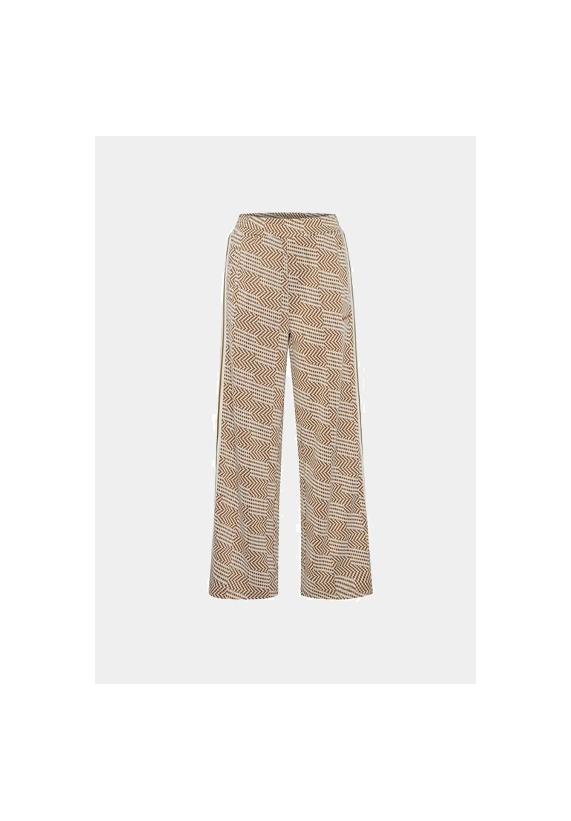 Joggingbroek Sima jacquard voor dames van het merk The Jogg Concept. Deze broek is verkrijgbaar in een tof patroon in een ivoor wit met camel kleurencombinatie.