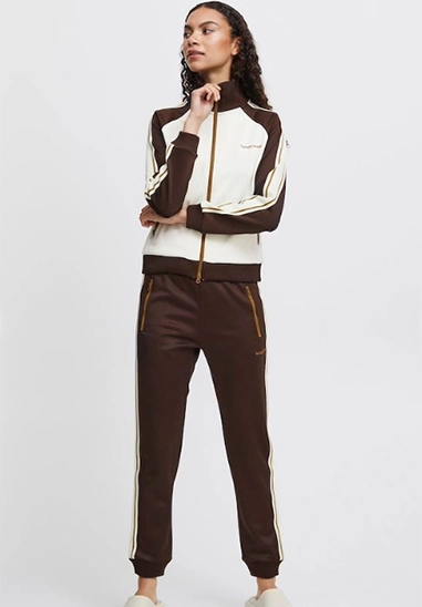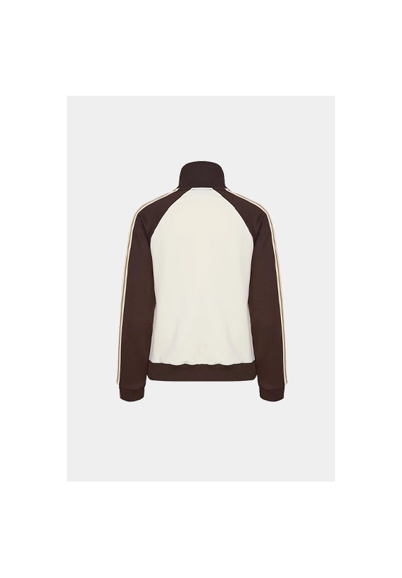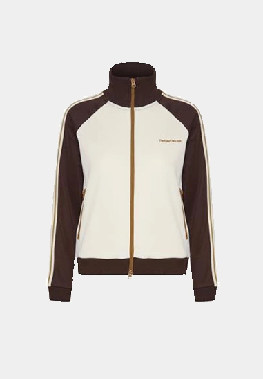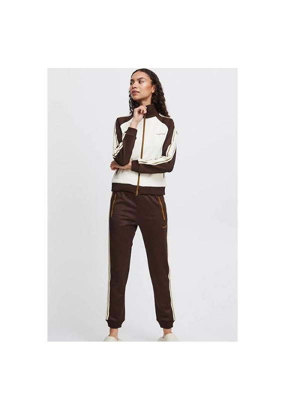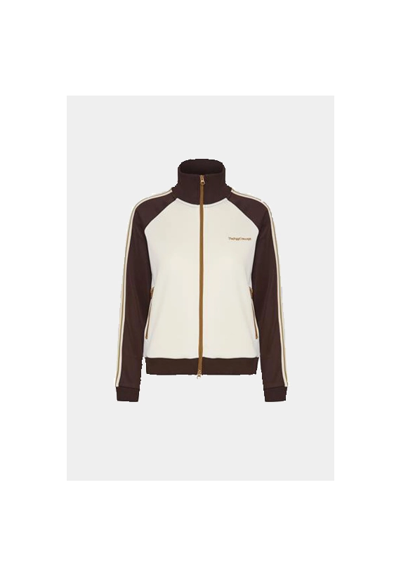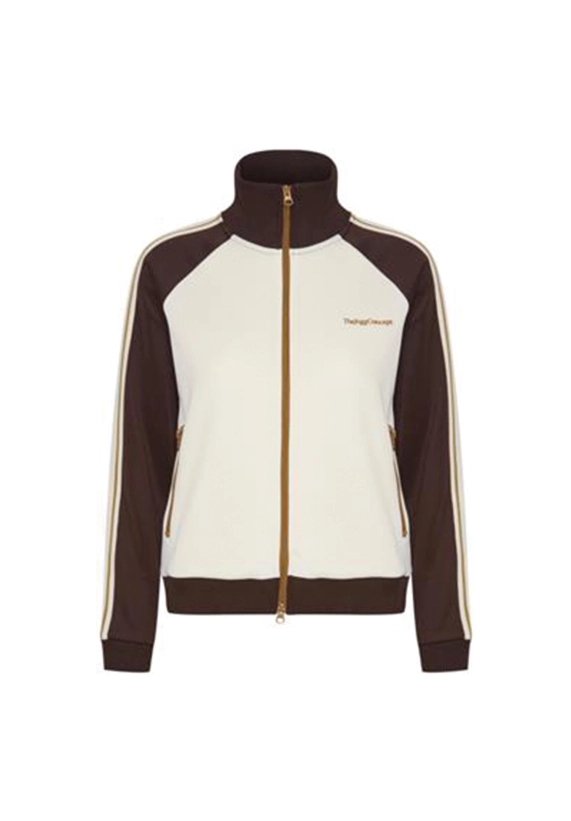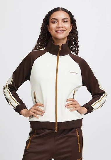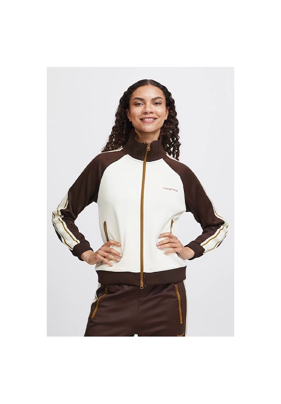 Vest Sima voor dames van het merk van The Jogg Concept. Sportief vest met rits. Verkrijgbaar in ivoor wit met groene en bruine accenten.