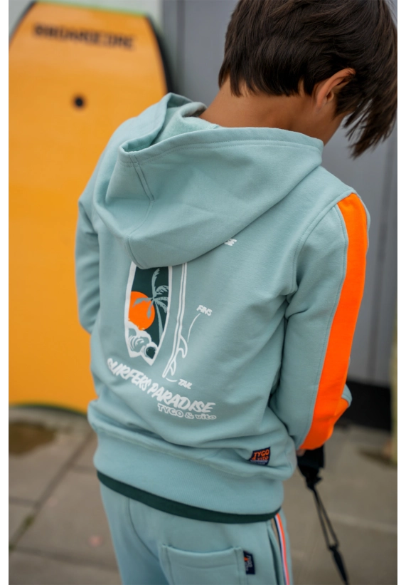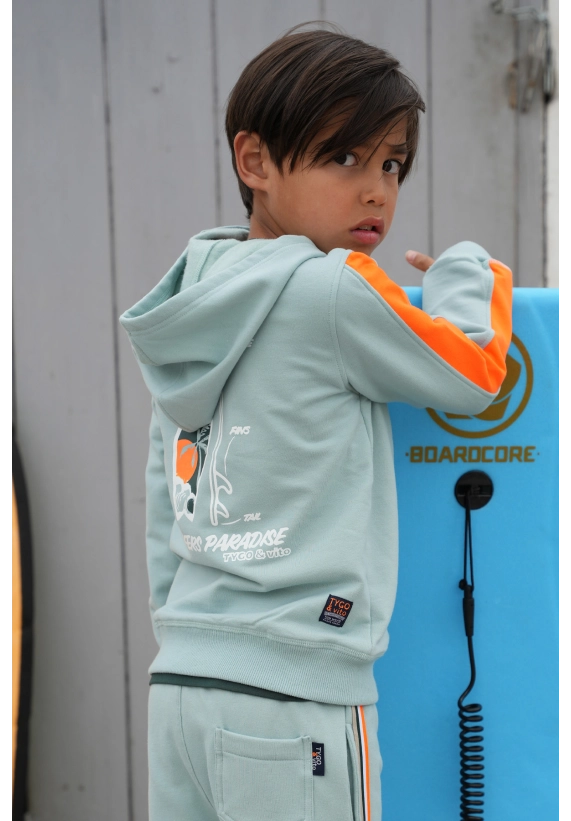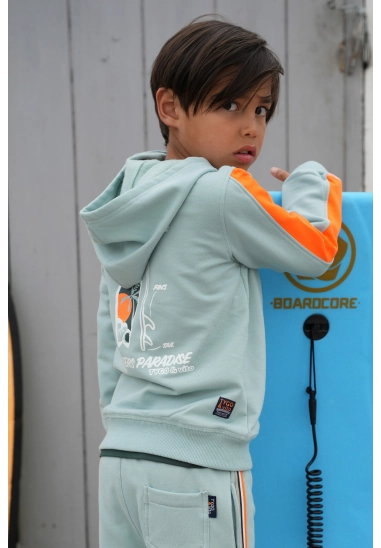 Fel oranje zijstreep aan de zijkant van de mouw.