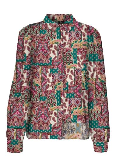 De blouse heeft een multicolour allover print. Lange mouw, satijn-look en met kraagje. Verkrijgbaar in een blauw en rood achtige kleurencombinatie.