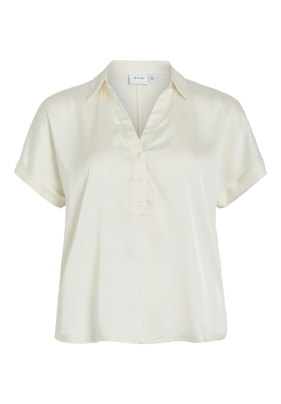 Poloshirt Enna voor dames van het merk Vila. Verkrijgbaar in de kleur ivoor wit & beige.