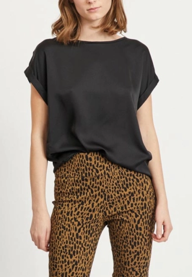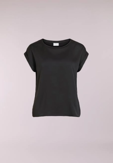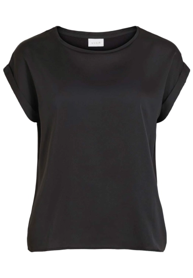 Shirt Ellette voor dames van het merk Vila. Het shirt met korte mouwen en een ronde hals heeft een satijne voorkant. Verkrijgbaar in diverse kleuren.