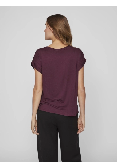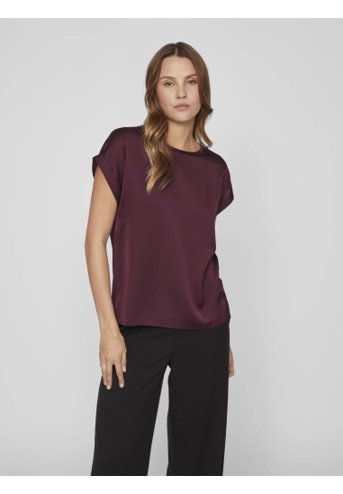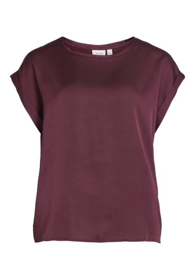 Shirt Ellette voor dames van het merk Vila. Het shirt met korte mouwen en een ronde hals heeft een satijne voorkant. Verkrijgbaar in diverse kleuren.