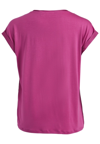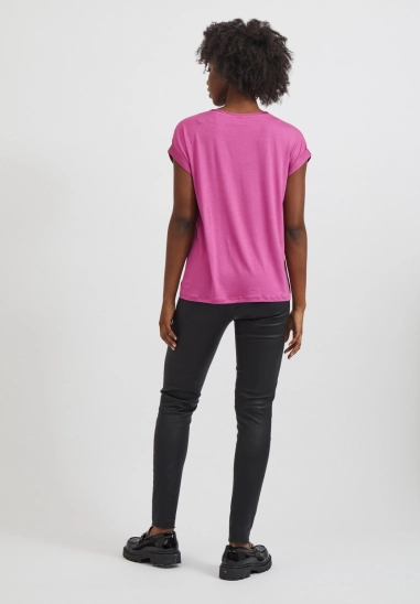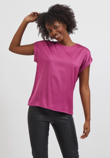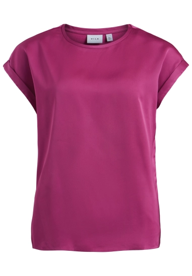 Shirt Ellette voor dames van het merk Vila. Het shirt met korte mouwen en een ronde hals heeft een satijne voorkant. Verkrijgbaar in diverse kleuren.