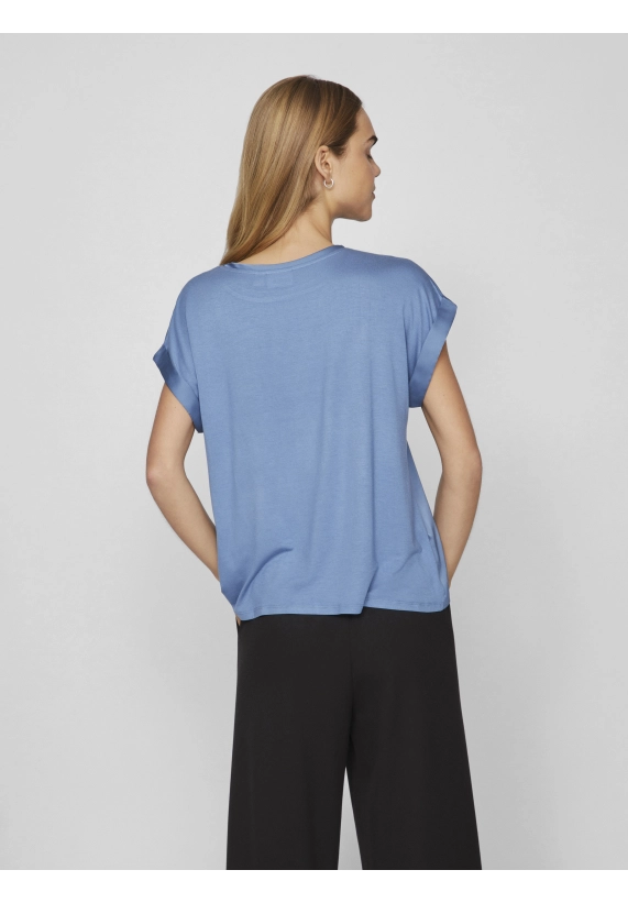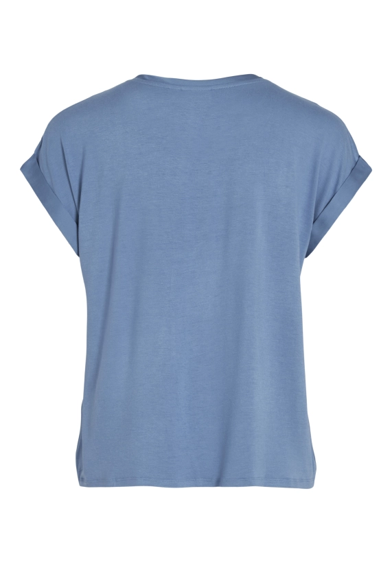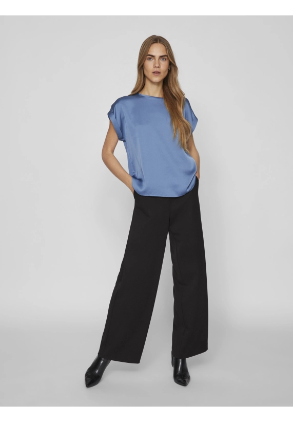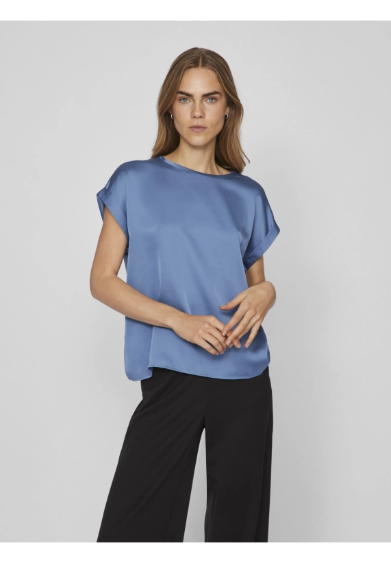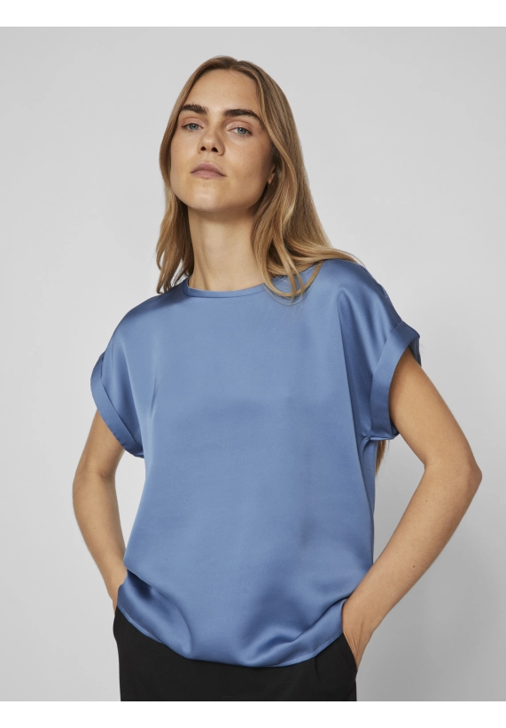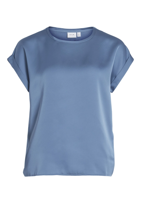 Shirt Ellette voor dames van het merk Vila. Het shirt met korte mouwen en een ronde hals heeft een satijne voorkant. Verkrijgbaar in diverse kleuren.