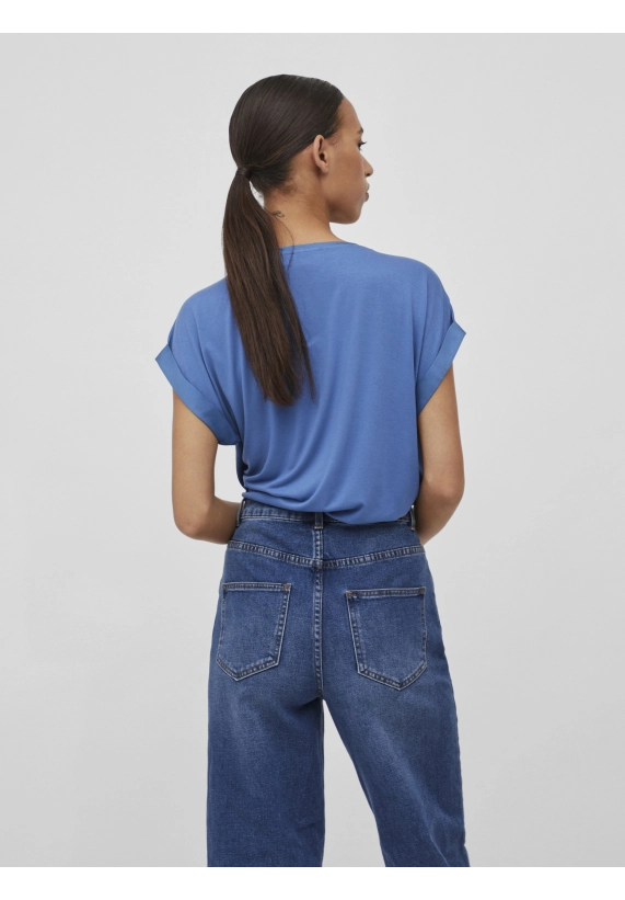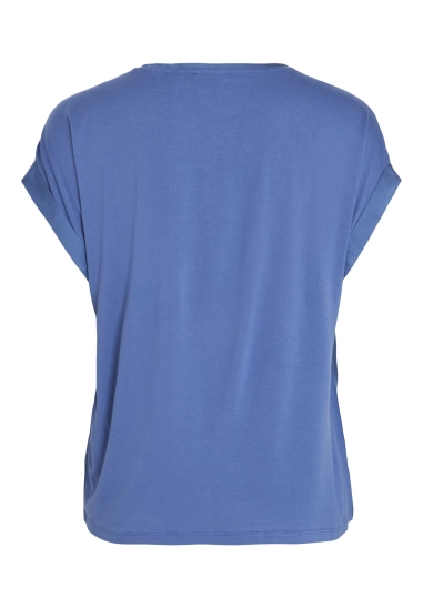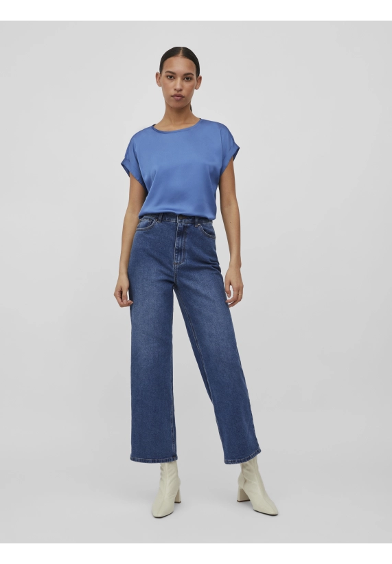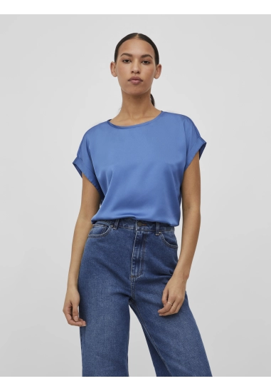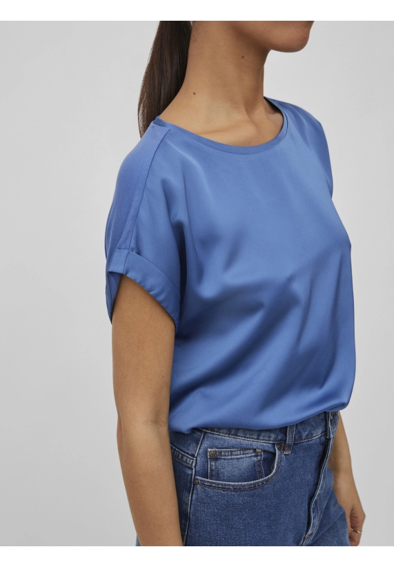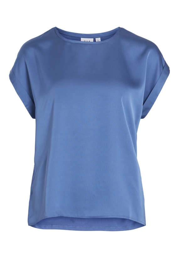 Shirt Ellette voor dames van het merk Vila. Het shirt met korte mouwen en een ronde hals heeft een satijne voorkant. Verkrijgbaar in diverse kleuren.