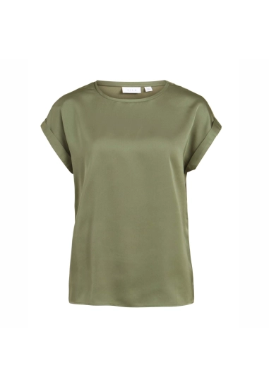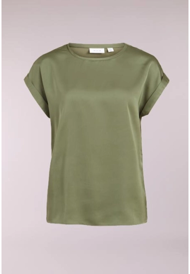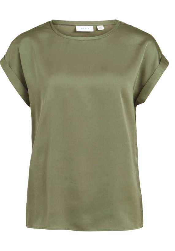 Shirt Ellette voor dames van het merk Vila. Het shirt met korte mouwen en een ronde hals heeft een satijne voorkant. Verkrijgbaar in diverse kleuren.