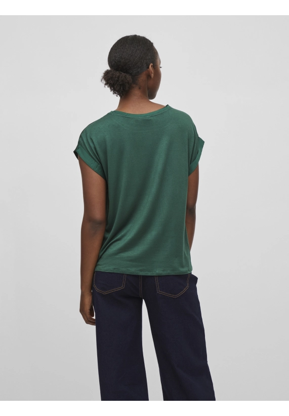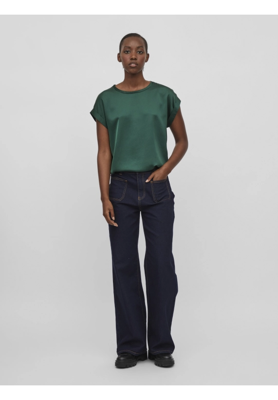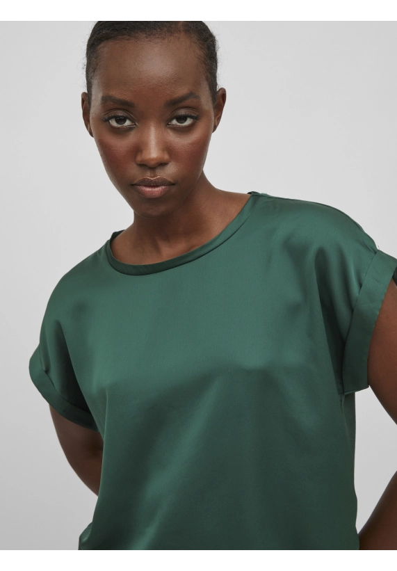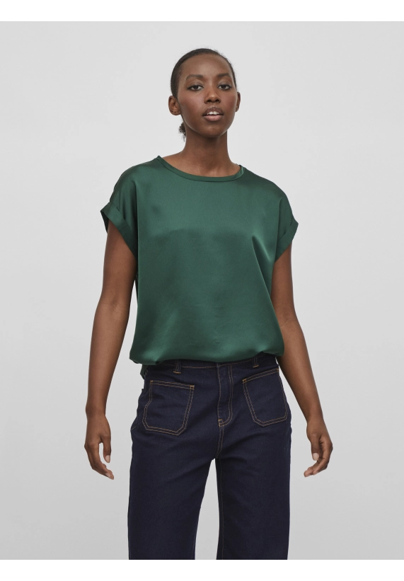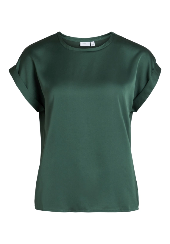 Shirt Ellette voor dames van het merk Vila. Het shirt met korte mouwen en een ronde hals heeft een satijne voorkant. Verkrijgbaar in diverse kleuren.
