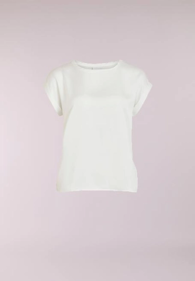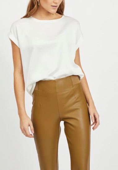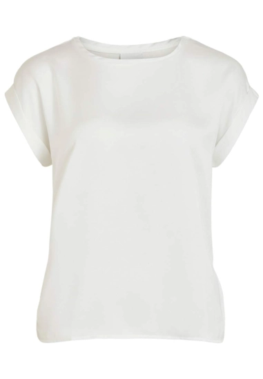 Shirt Ellette voor dames van het merk Vila. Het shirt met korte mouwen en een ronde hals heeft een satijne voorkant. Verkrijgbaar in diverse kleuren.