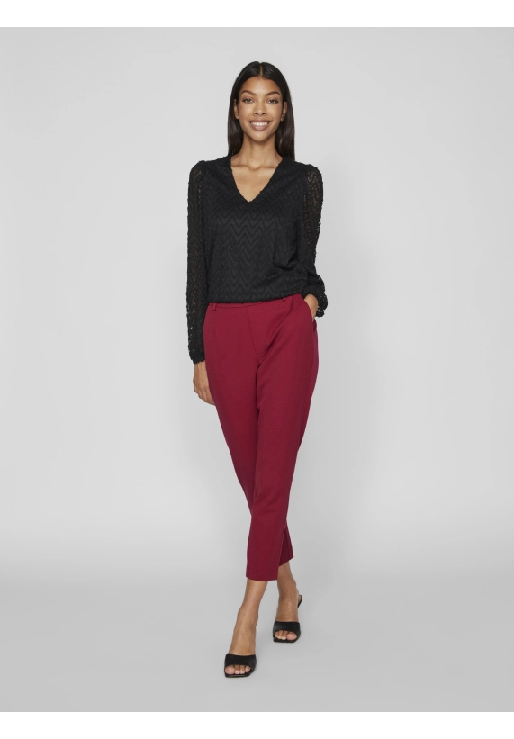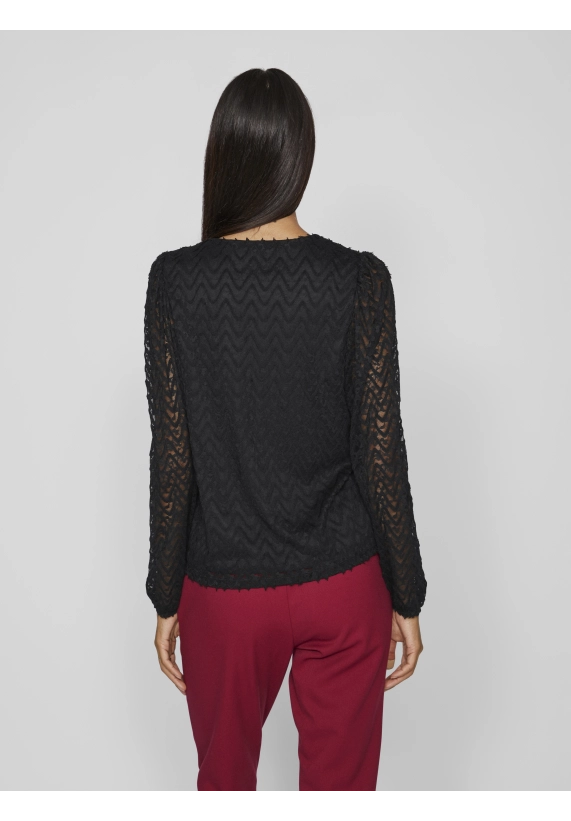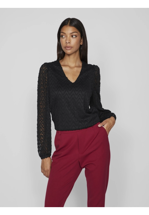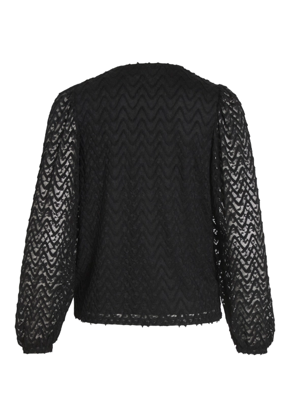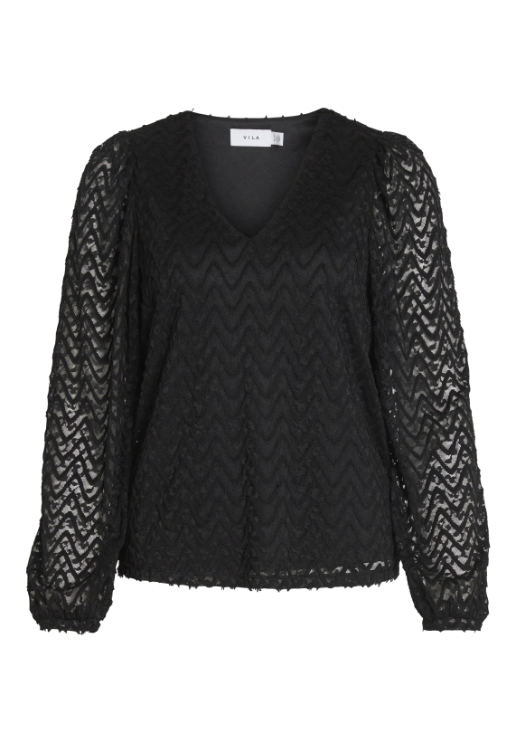 Shirt Fary vor dames van het merk VILA. Het shirt heeft een v-hals en een ingeweven golfpatroon. Verkrijgbaar in zwart en donker groen.