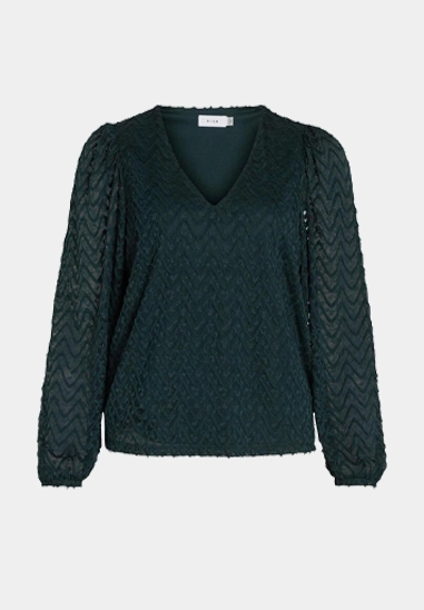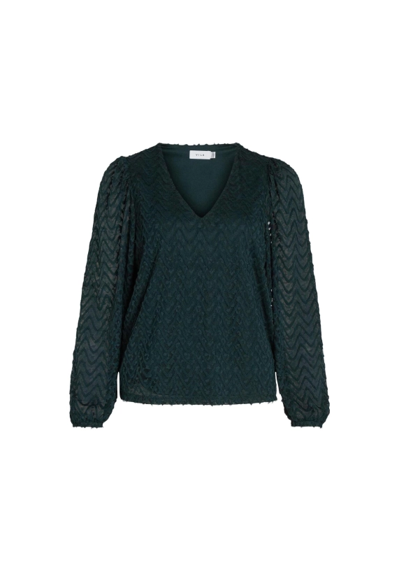 Shirt Fary vor dames van het merk VILA. Het shirt heeft een v-hals en een ingeweven golfpatroon. Verkrijgbaar in zwart en donker groen.
