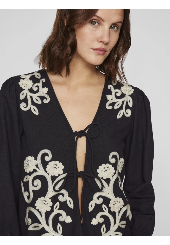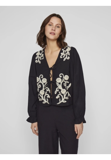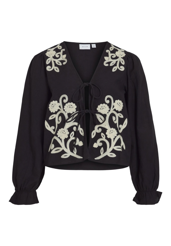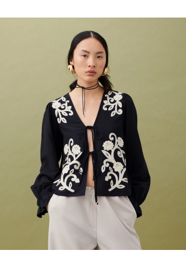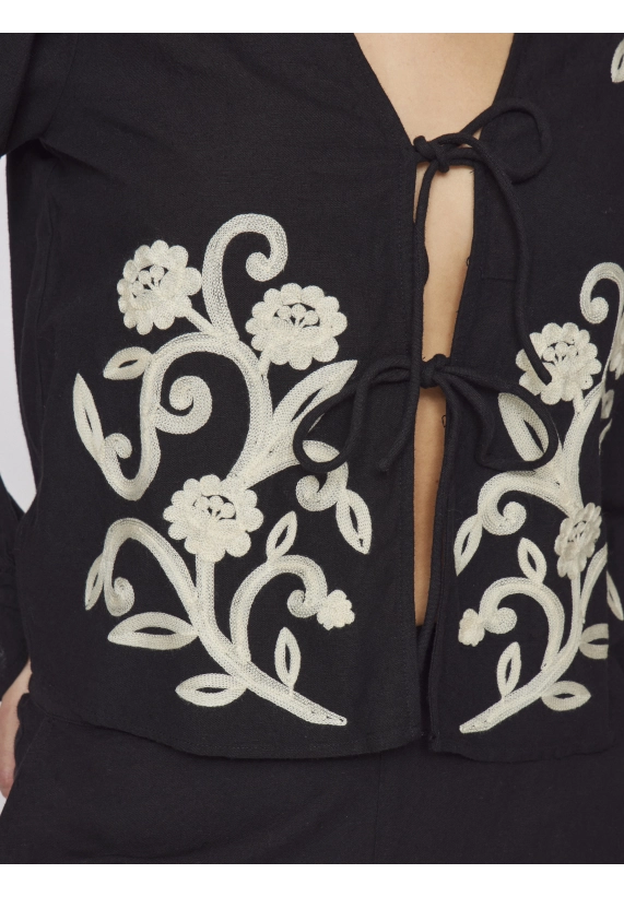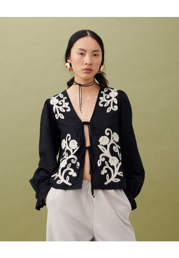 Verkrijgbaar in de kleur zwart met beige borduursel.