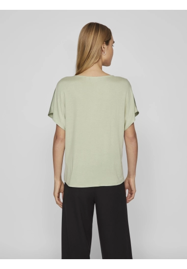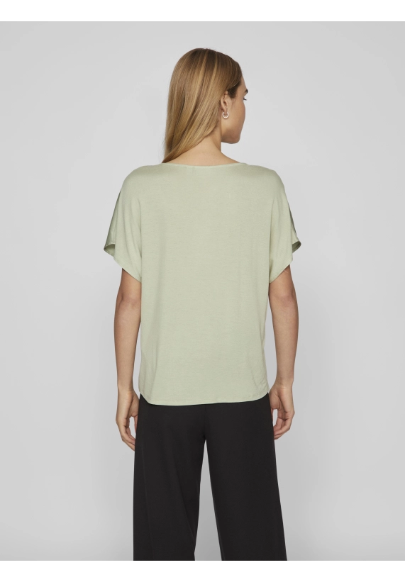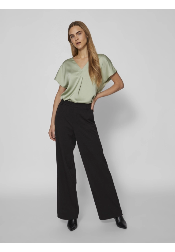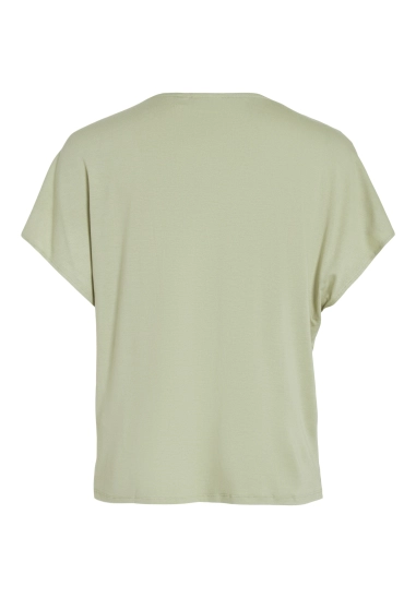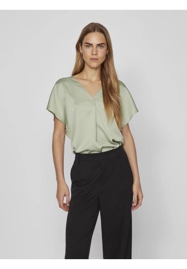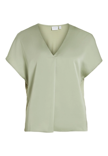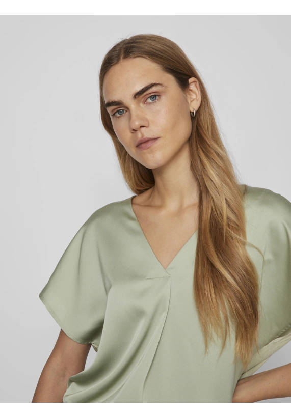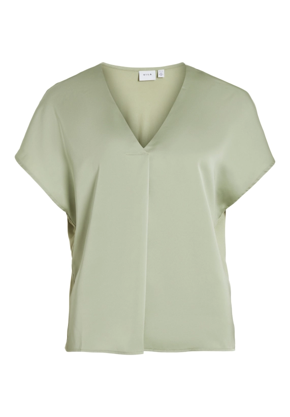 Shirt Ellette voor dames van het merk Vila. Dit shirt met korte mouw heeft een mooie v-hals en heeft een satijne voorzijde. Verkrijgbaar in diverse kleuren.