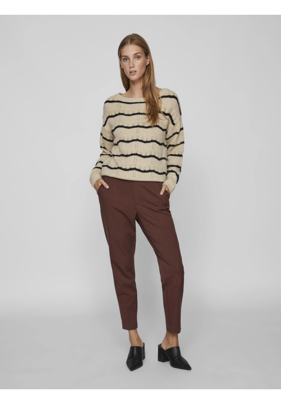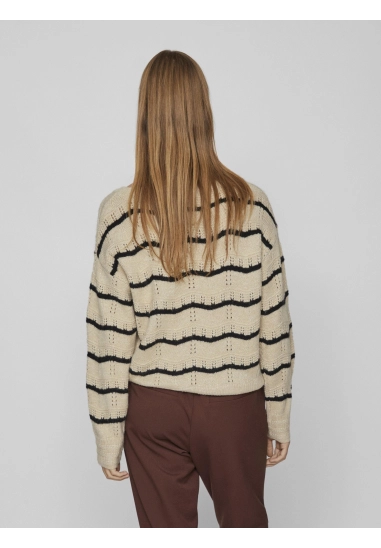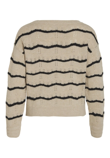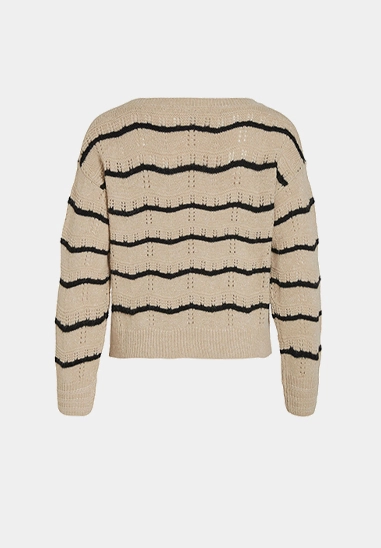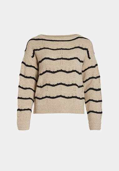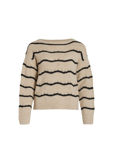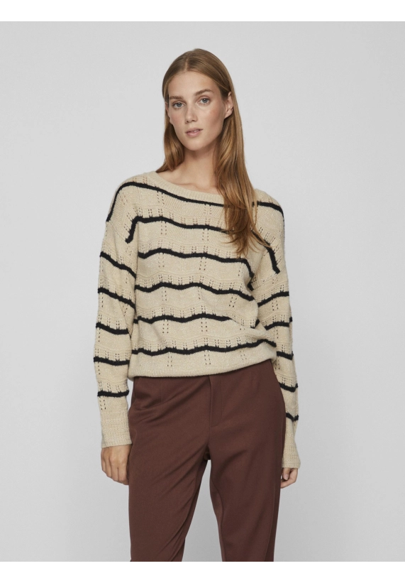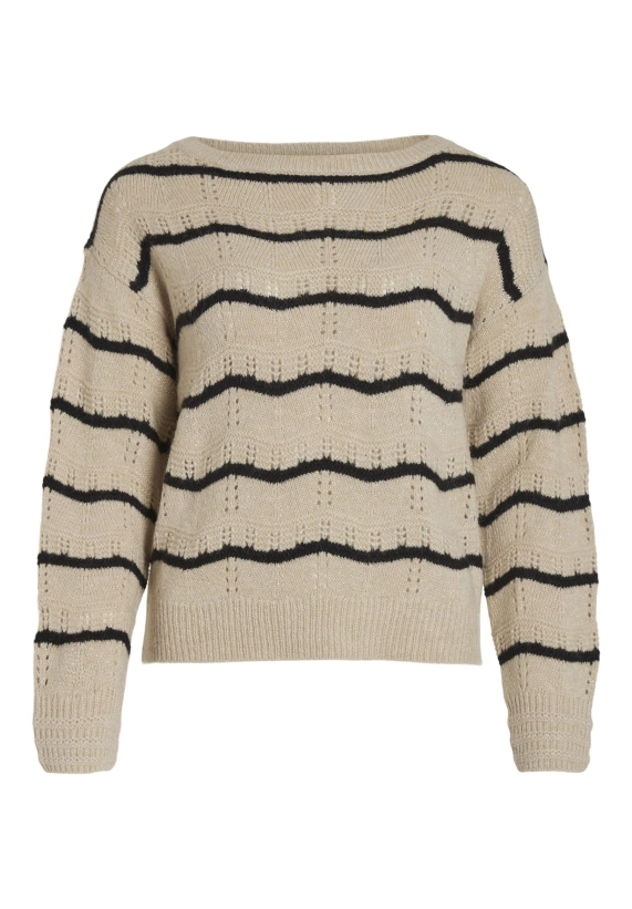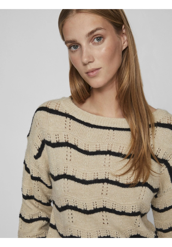 Trui Polana voor dames van het merk VILA. De trui heeft een golvende streep en een gouden lurex draad. Deze gebreide trui is opengewerkt en heeft een wat wijdere ronde hals. Verkrijgbaar in beige met zwarte streep.