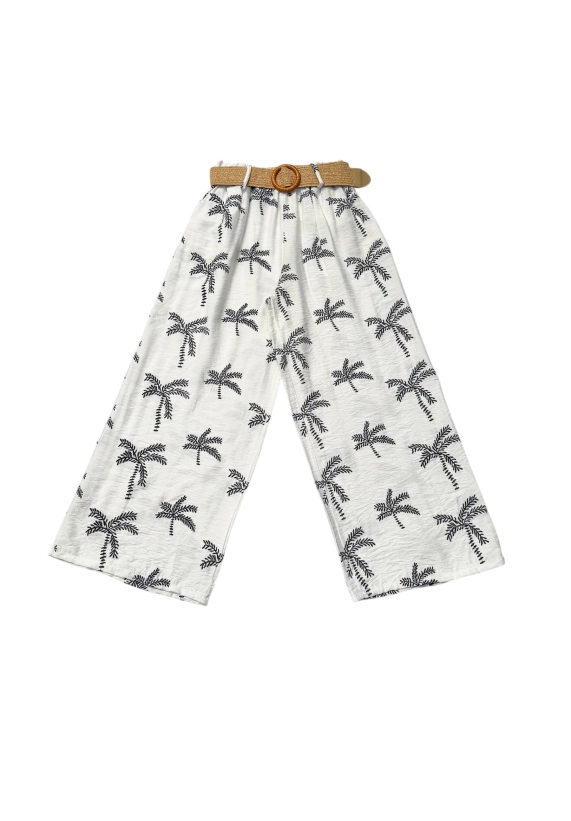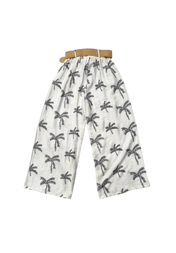 De broek heeft een leuke palmboom opdruk en wijde broekspijpen.