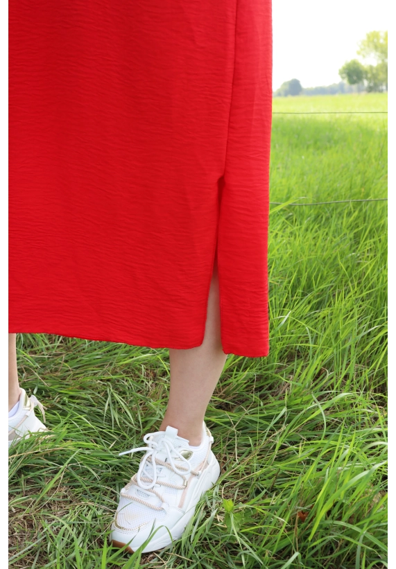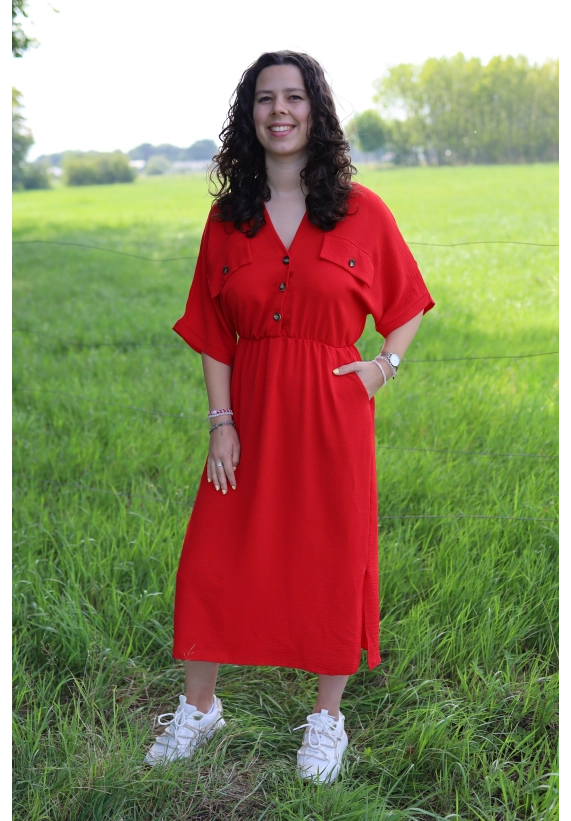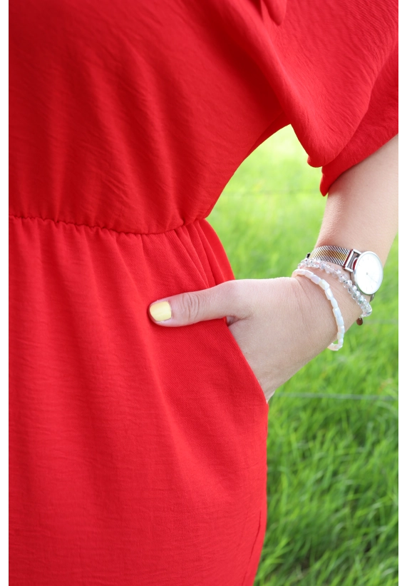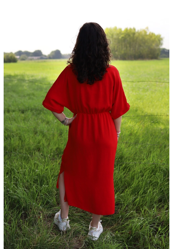 De jurk is gemaakt van een lichte stof die fijn draagt en soepel valt. Verkrijgbaar in de kleuren rood en zwart. Het model op de foto is 1.67 m en draagt maat S.