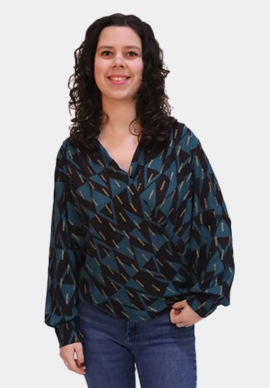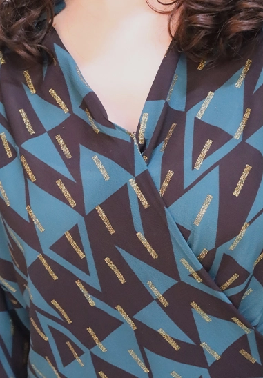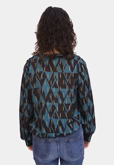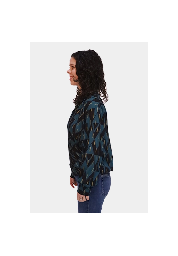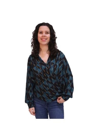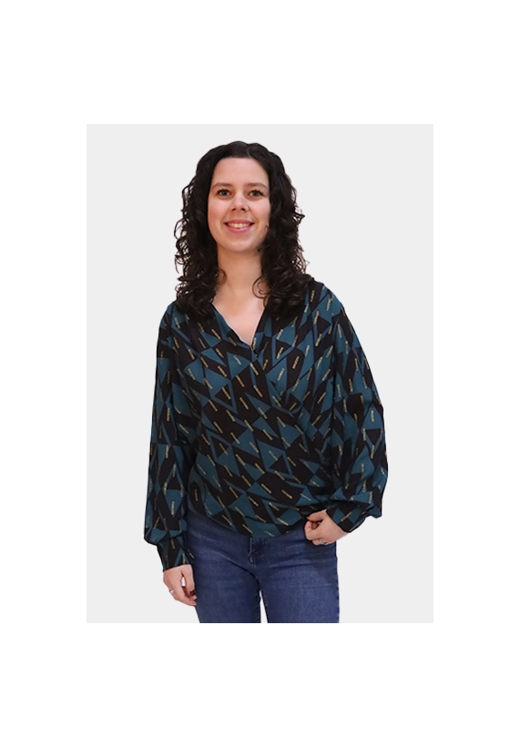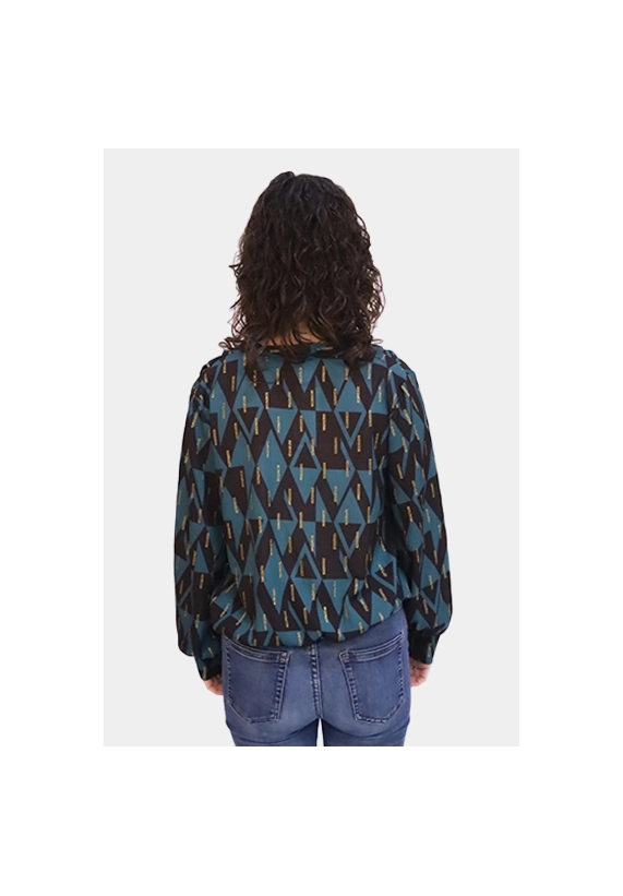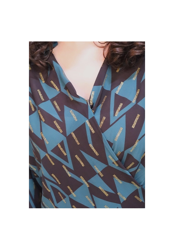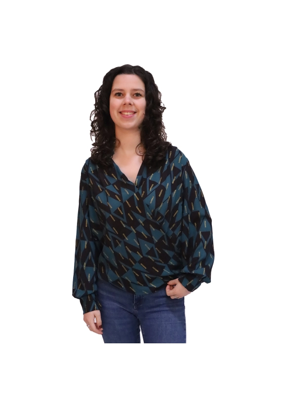 Overslag shirt voor dames van het merk Wild Ones. Het allover print shirt heeft gouden accenten en verkrijgbaar in een petrol blauwe en beige kleurencombinatie.