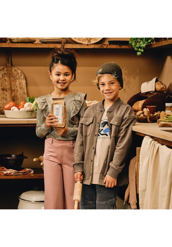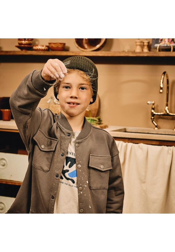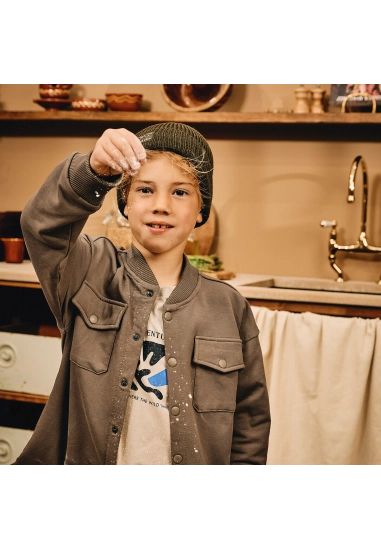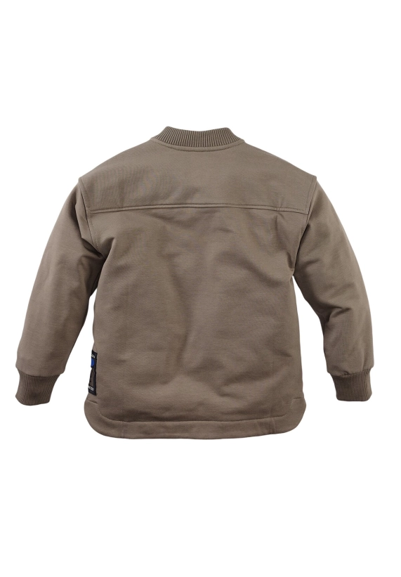 Gemaakt van een sweat stof en hij is afgewerkt met ribboorden bij de mouwen en nek.