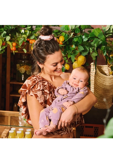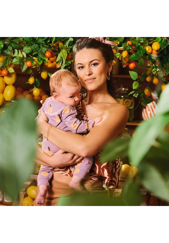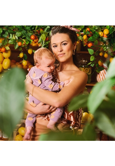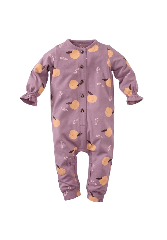 Verkrijgbaar in de kleur paars met allover perziken patroon op het boxpakje